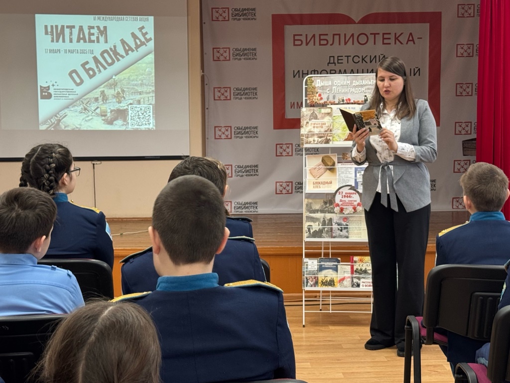 Сотрудник библиотеки провел для детей обзор книг, посвященных блокаде Ленинграда, порекомендовав для прочтения книги: «900 дней мужества» В. Воскобойникова , «Дети блокады» М. Сухачёва, «Хлеб той зимы» Э. Фоняковой, «Девочки с Васильевского острова» Ю. Яковлева и др.