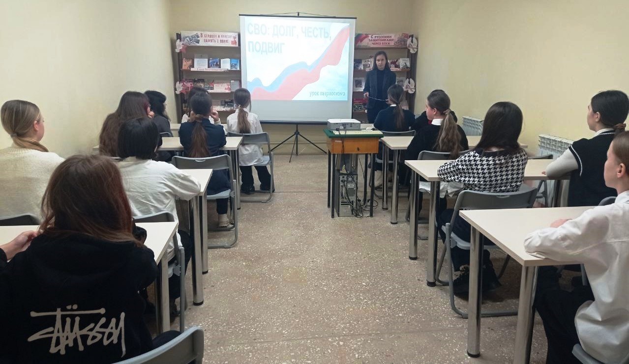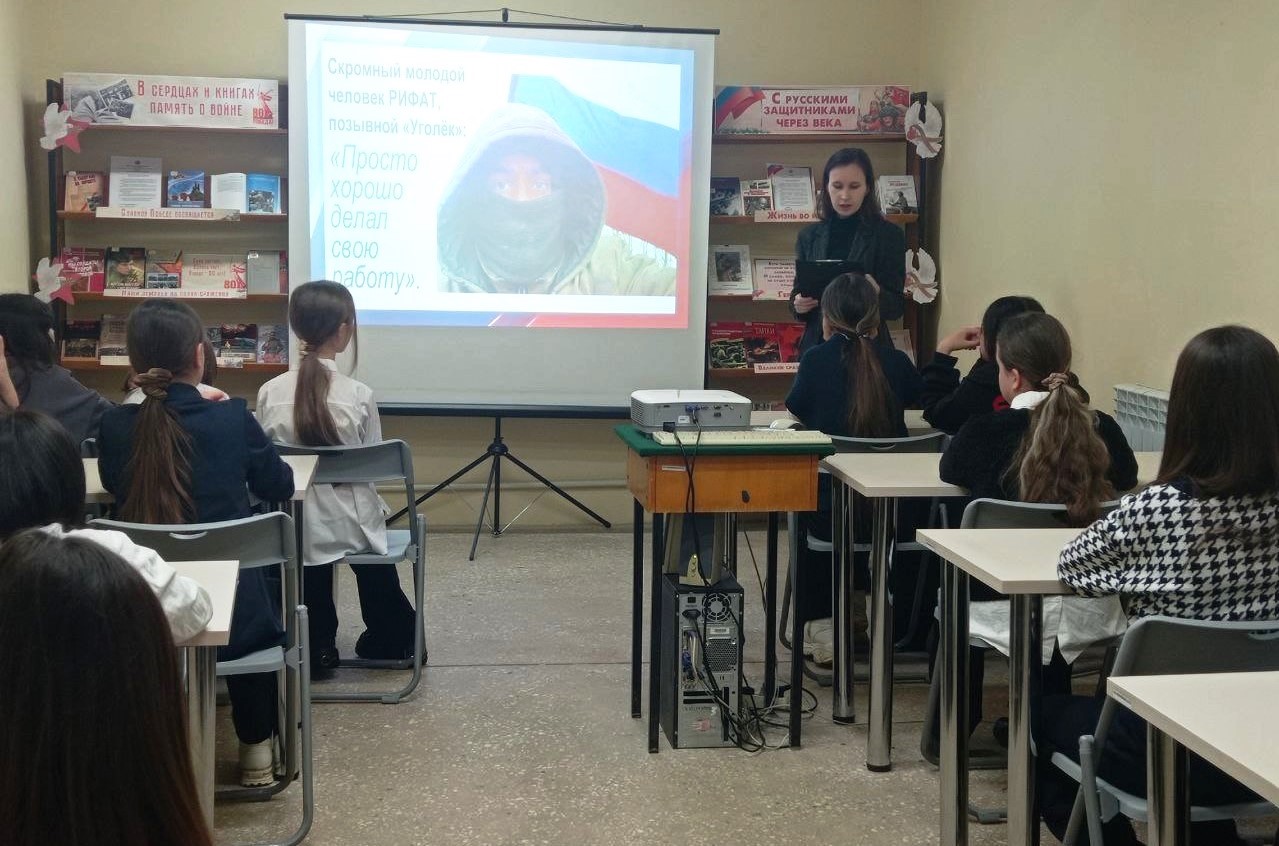На мероприятии шестиклассники вместе с библиотекарем поговорили о любви к Родине, воинском долге, службе во благо Отечества. Библиотекарь рассказала о бойцах из Чувашской Республики, проявивших мужество, героизм, выполняя свой долг с честью.