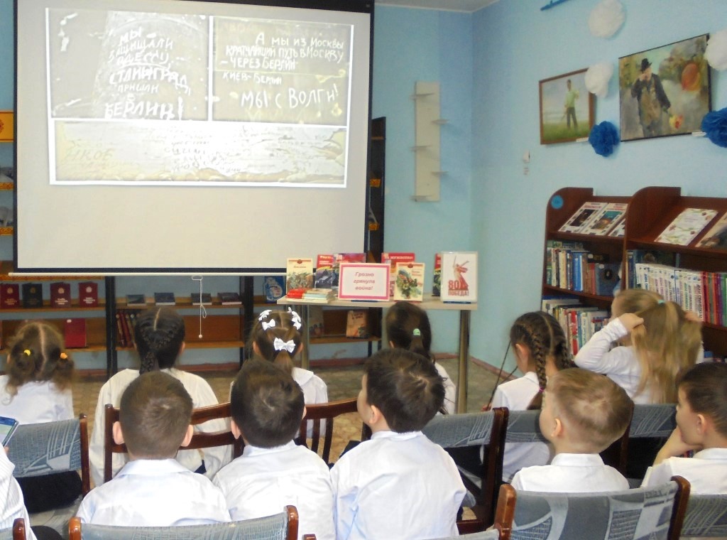 Библиотекарь интересно рассказала дошкольникам о крупнейших сражениях, о победах и героизме советских солдат и офицеров. Ребята узнали о том, что война – это бесстрашие защитников Бреста, это грандиозная битва у стен Москвы, как сокрушили наши солдаты фашистский «Тайфун», это великий подвиг ленинградцев, Ленинграда, это добытая огнем и кровью победа под Сталинградом, это подвиг советских солдат в битве на Курской дуге, это штурм Берлина, это память сердца всего народа.