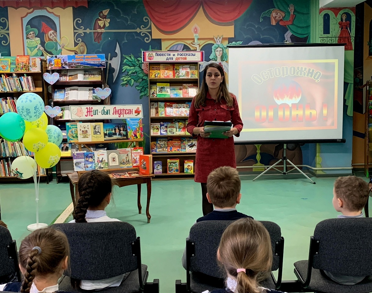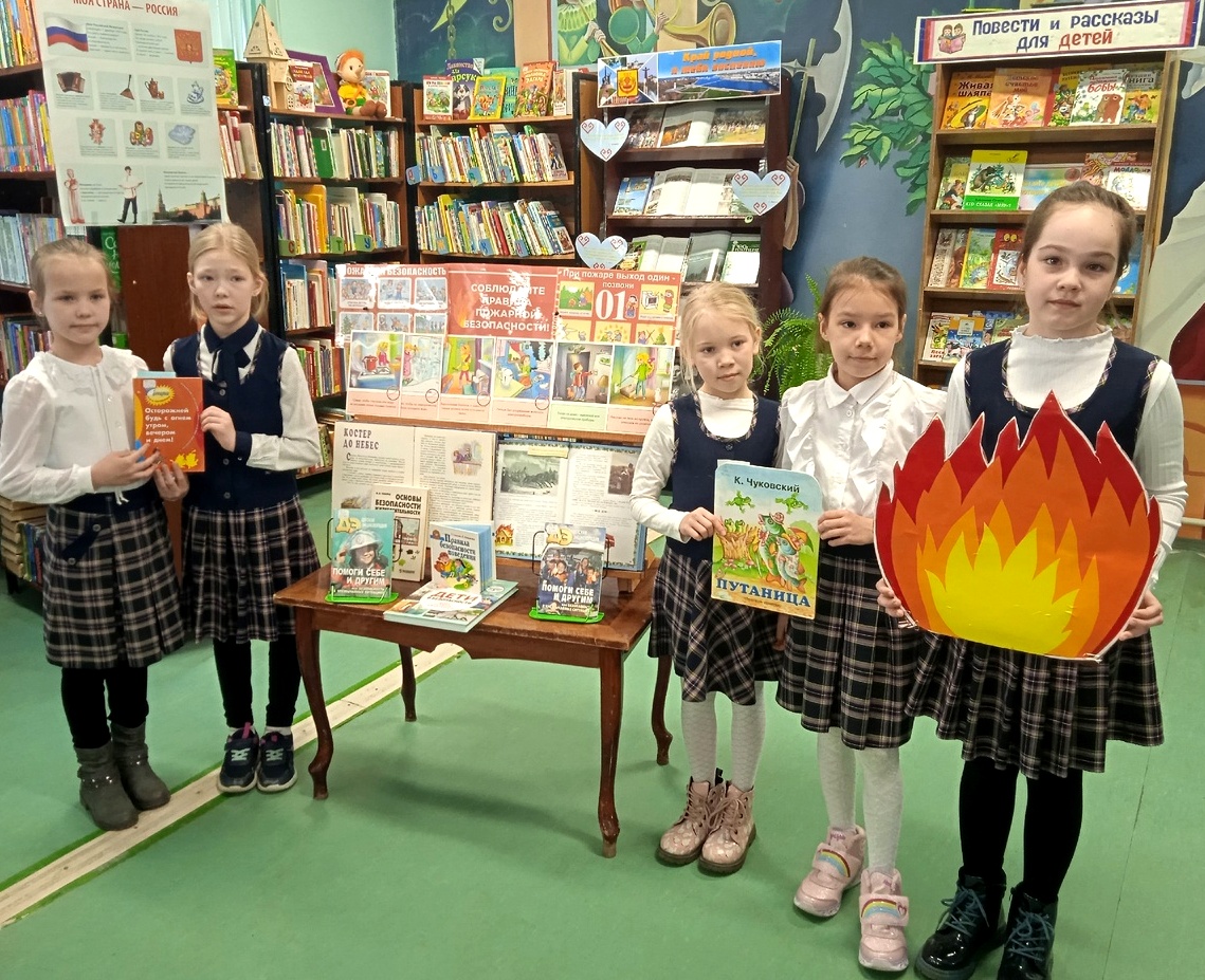 Сотрудники библиотеки знакомят школьников с произведениями детских писателей о пожаре: со сказками С.Маршака «Кошкин дом» и К. Чуковского «Путаница». После прочтения сказок дети отвечают, какие правила безопасного обращения с огнем и спичками нарушили герои книг.