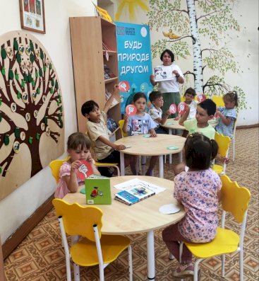 Затем ребята «вырастили» «Дерево добра». Каждый получил красивый листочек с картинками, изображающими добрые дела: ребёнок гладит кошку, девочка поливает цветы, мальчик убирает мусор, подкармливает птиц и так далее. Эти листочки дети с радостью приклеили на дерево, и получилось раскидистое и яркое «Дерево добра».