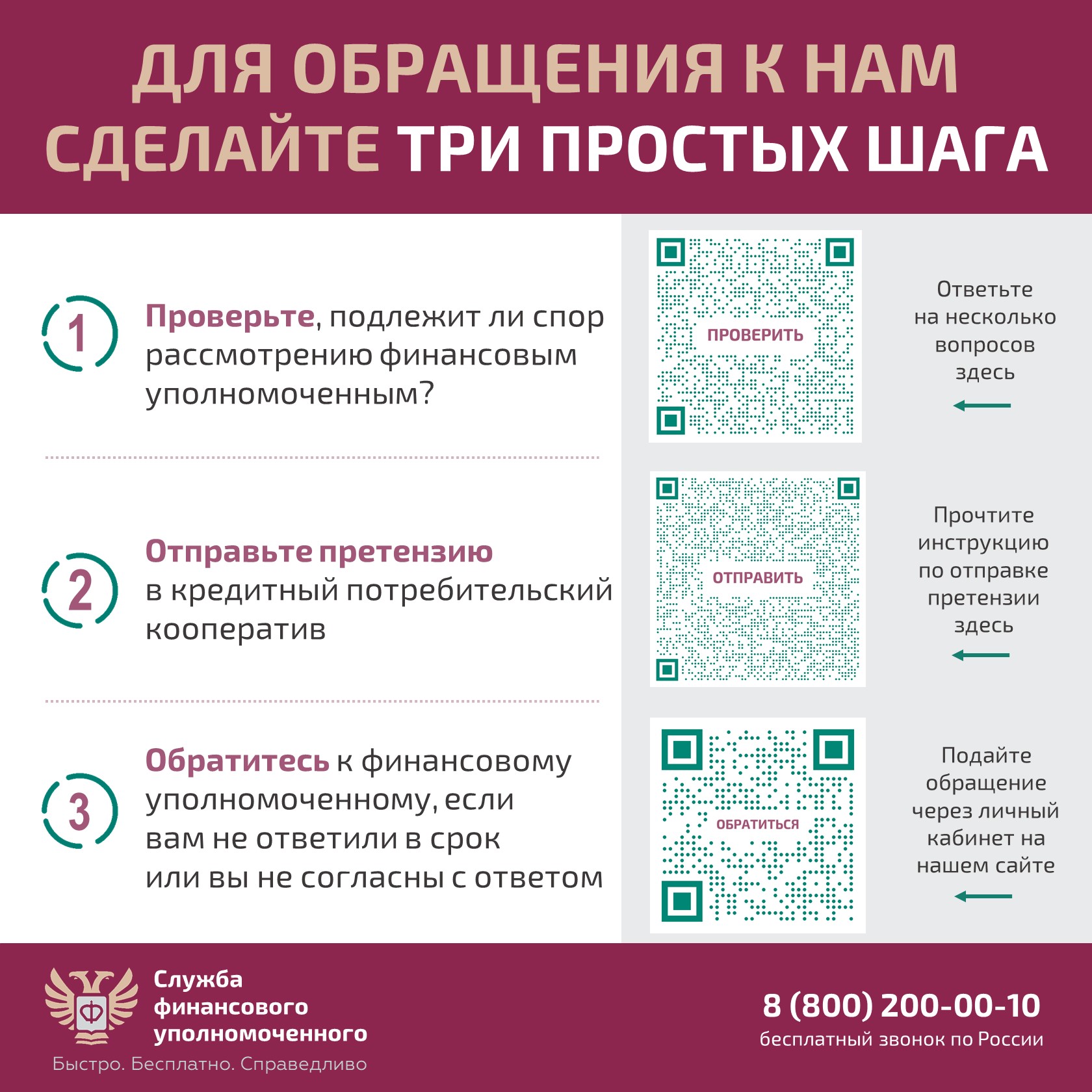 Для решения спора с КПК без суда обратитесь к финансовому уполномоченному. Он бесплатно рассматривает в досудебном порядке обращения клиентов КПК – физических лиц, содержащие денежные требования в размере не более 500 тысяч рублей.