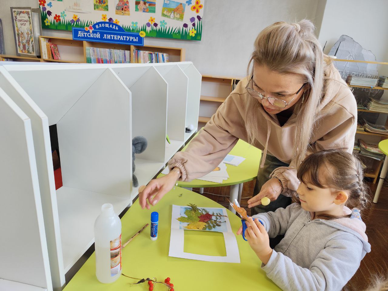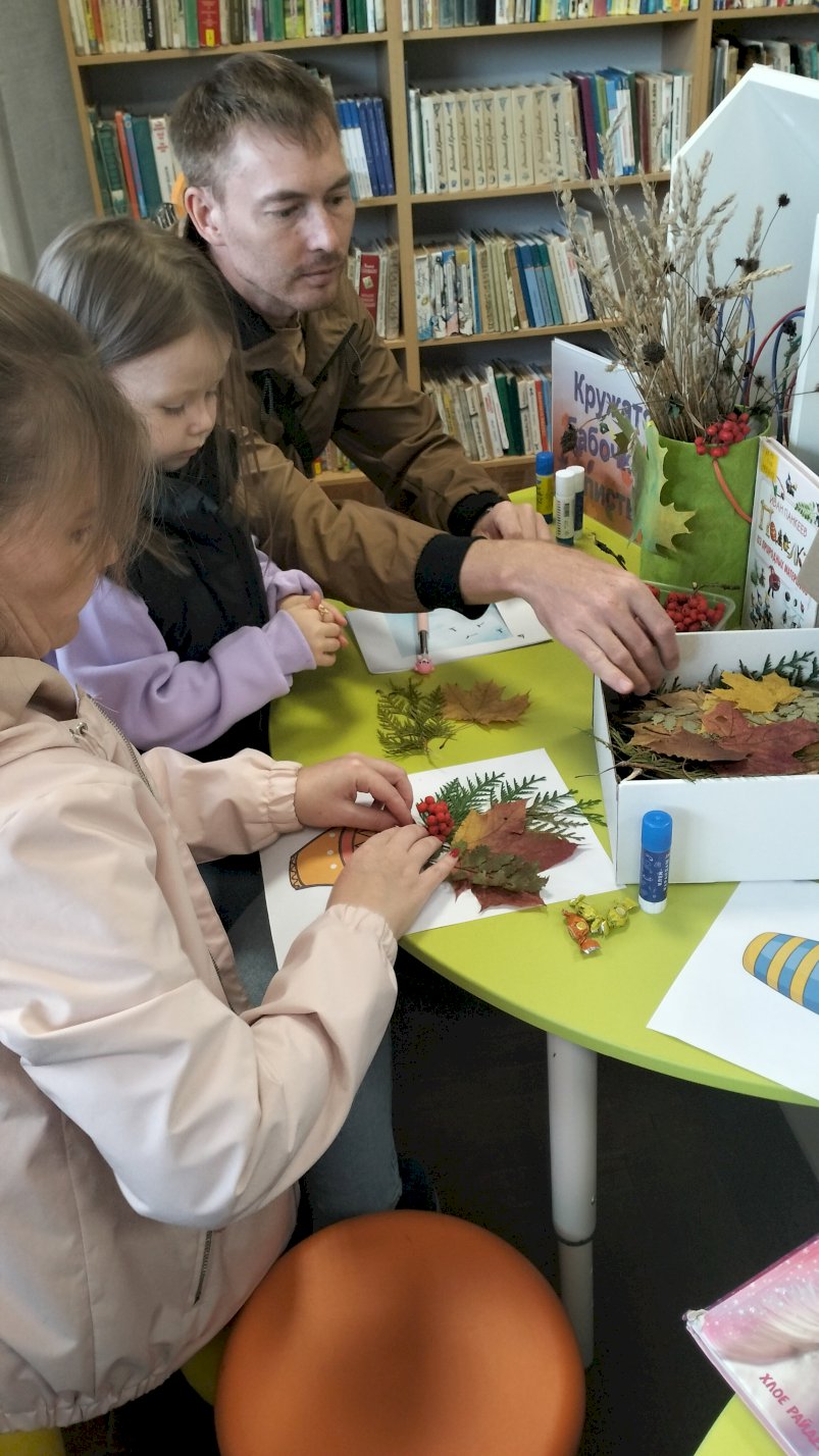 Для юных читателей отдел детской литературы подготовил занимательный мастер-класс «Кружатся бабочками листья», вдохновляющий детей создавать собственные произведения искусства. Дети познакомились с одной из самых популярных техник работы с природными материалами – ошибана. Ребятам были розданы бумажные заготовки и сухие осенние листья. Участники учились правильно располагать композицию на бумаге и подбирать подходящие по размеру листочки. Разложив листочки на бумажную заготовку, аккуратно промазывали каждый листик клеем-карандашом и крепили на бумажную заготовку. Дети и родители использовали в своих работах богатую осеннюю цветовую палитру, и в результате у каждого ребенка получилась своя неповторимая работа.