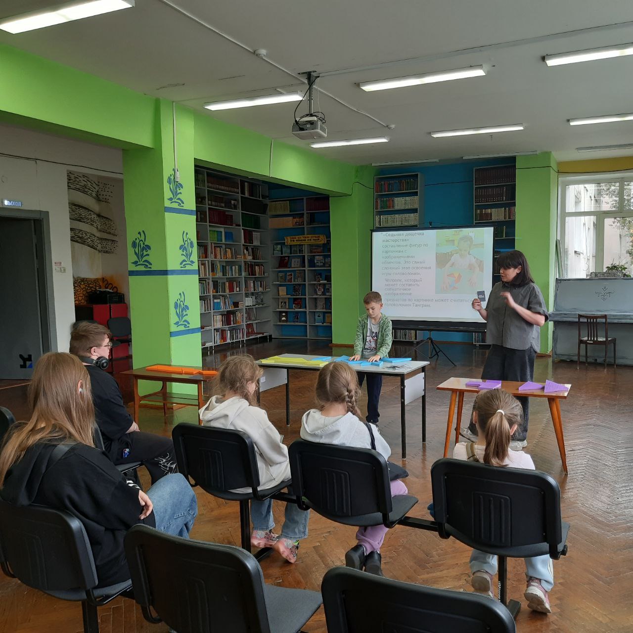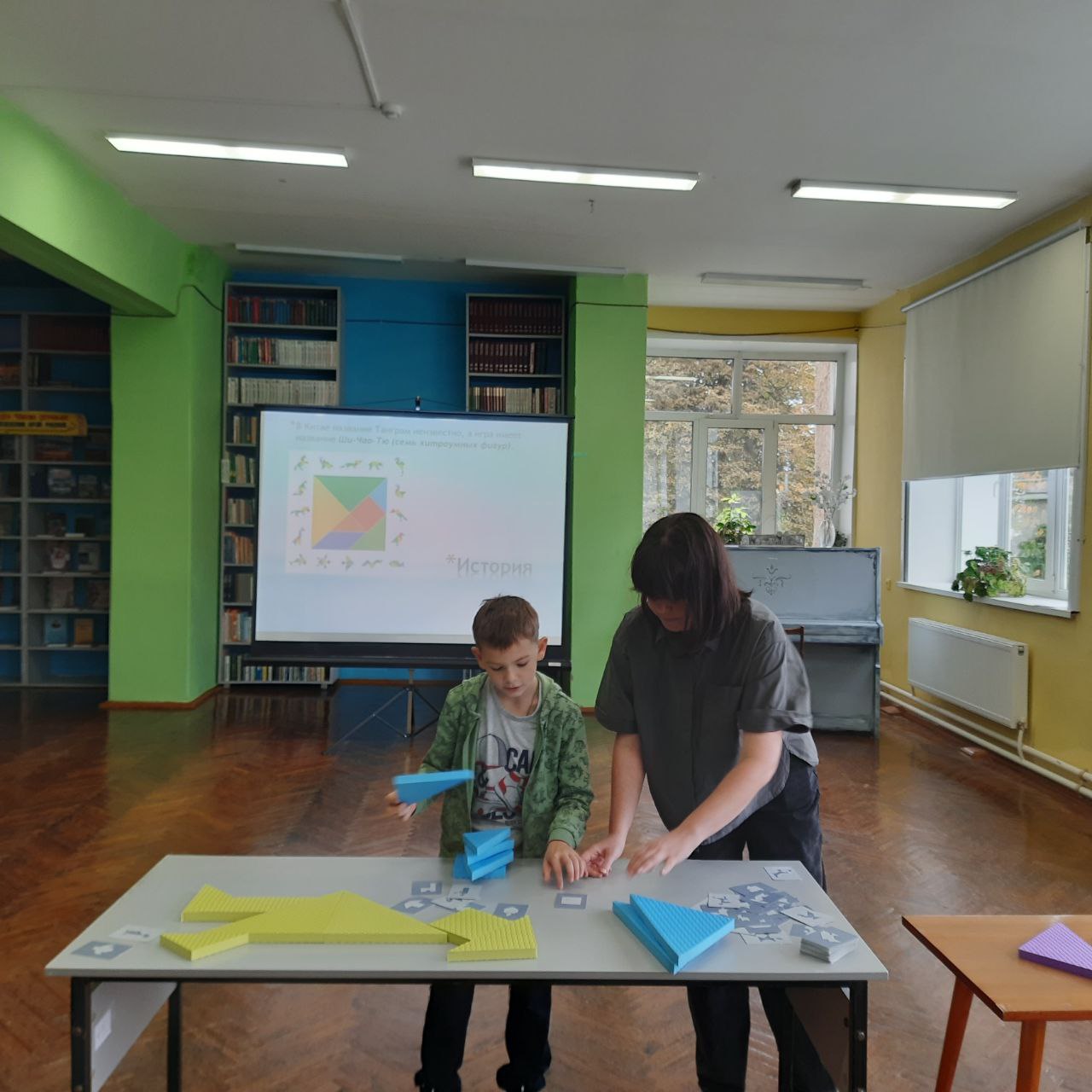 Также детям представилась прекрасная возможность вместе с детским психологом Филипповой Ольгой Николаевной сыграть в развивающую игру «Танграм». Участникам игры из фигурок определённой формы нужно было собрать разные вещи: силуэт человека, животных, птиц, домики, буквы или цифры. Ребят ожидала настоящая «зарядка для ума». Ольга Николаевна рассказала историю создания этой игры и отметила, что «Танграм» помогает развивать логическое мышление, мелкую моторику рук, интеллектуальные способности, память, сообразительность, внимание и усидчивость.