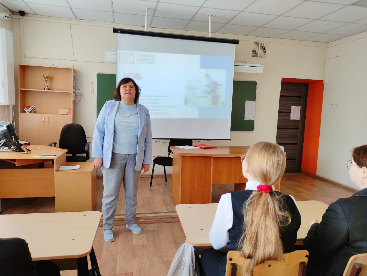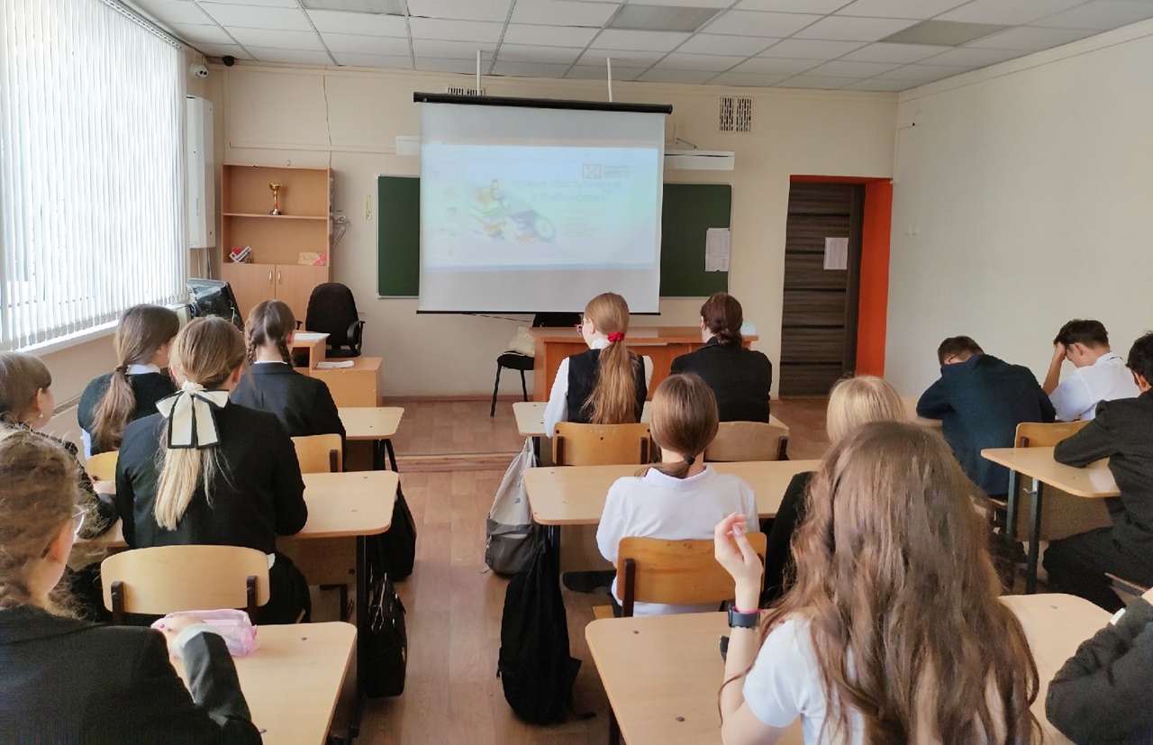 Девятиклассникам МАОУ «СОШ № 59» г. Чебоксары сотрудник Центральной городской библиотеки им. В. Маяковского рассказала про электронные библиотеки: НЭБ и мобильное приложение «Свет», а также НЭБ.Дети и Литрес. Заведующая сектором электронных ресурсов познакомила школьников также с книжными новинками городских библиотек возрастной категории 12+.