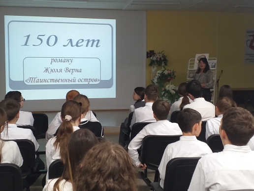 Далее библиотекарь рассказала о романе-робинзонаде «Таинственный остров», в котором на примере пяти поселенцев – отважных героев книги дано много советов, как выжить на необитаемом острове.
