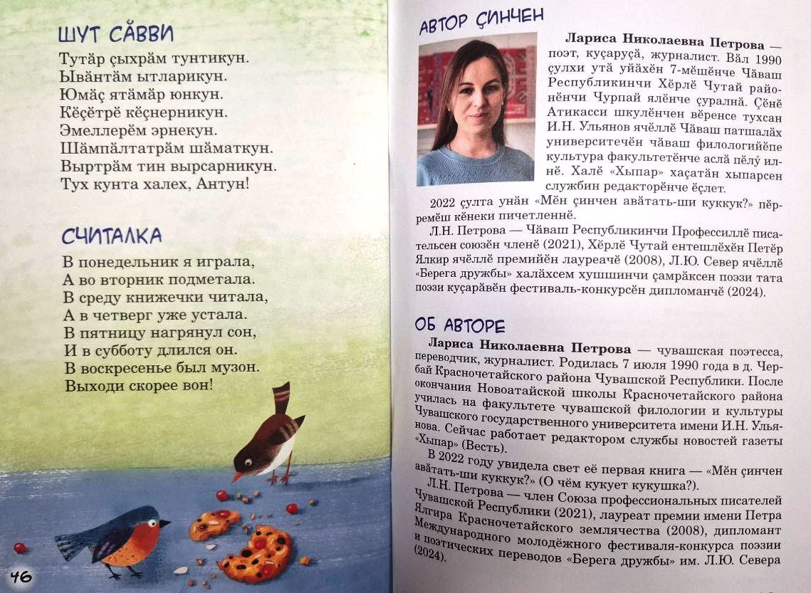 Об этом рассказывает новинка Чувашского книжного издательства книга Ларисы Петровой «Кун ячĕсем. Дни недели». Редактор – Ольга Федорова, художник – Юлия Лутошкина, издана на чувашском языке в переводе на русский.