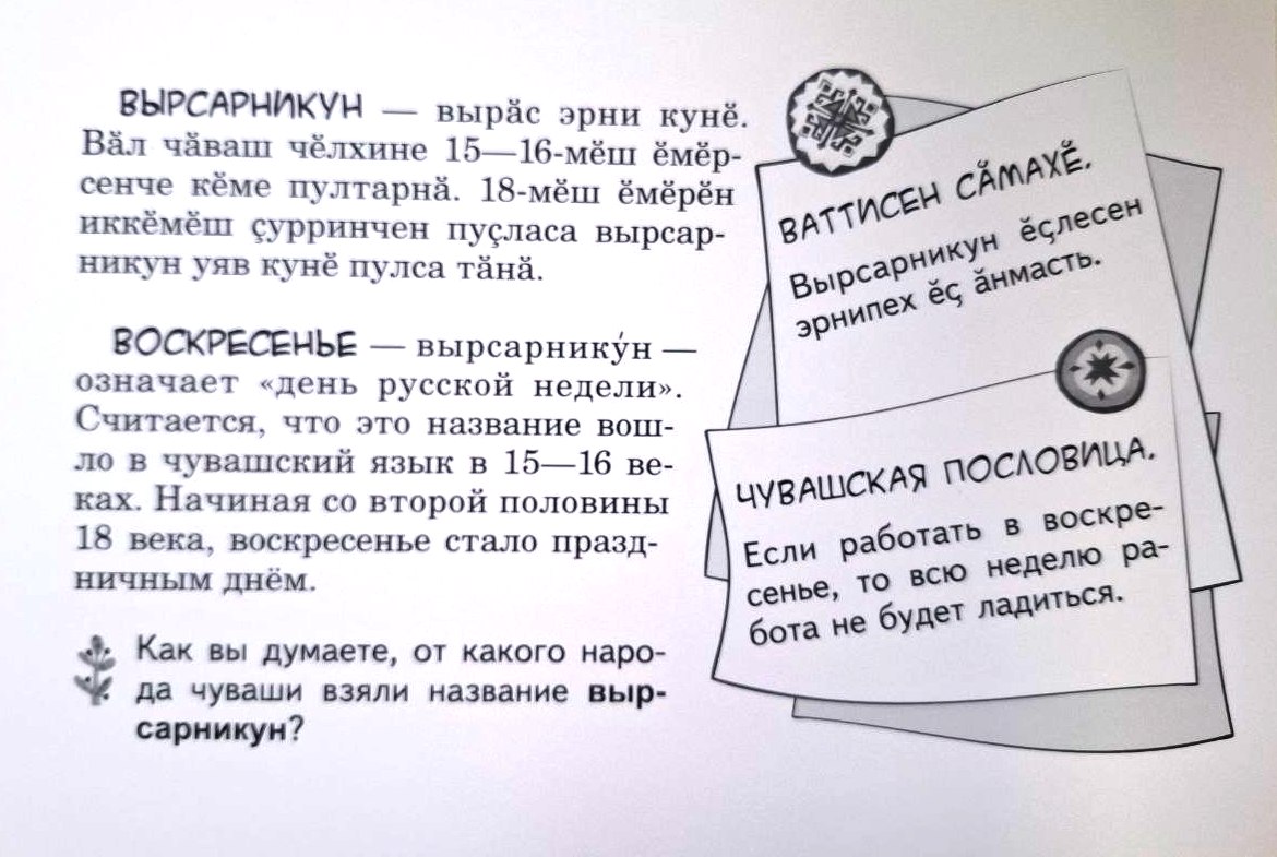 К книге прилагается набор карточек с названиями чувашских дней недели. Каждая из них расскажет о значении чувашских дней недели, приводится чувашская пословица, связанная с днем недели и есть небольшое задание, чтобы закрепить прочитанное.