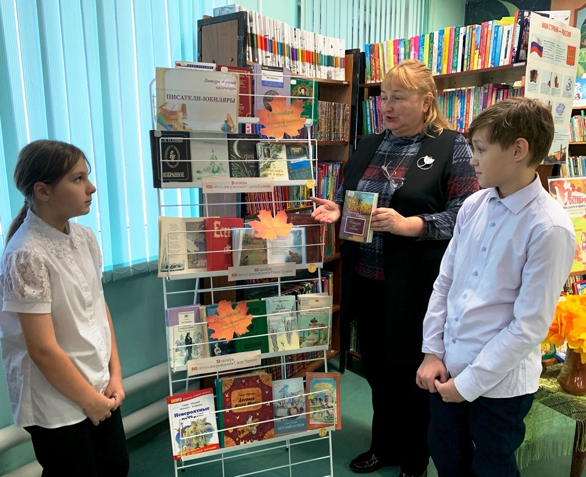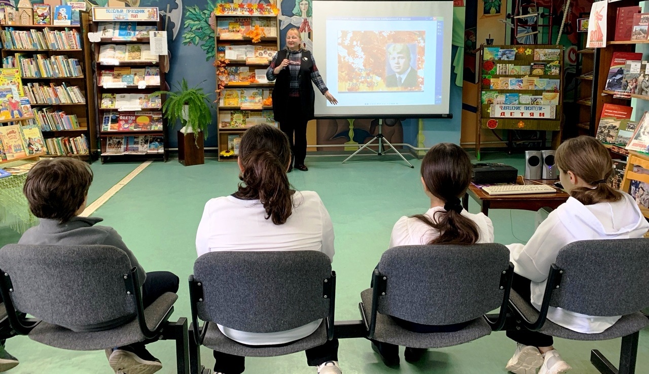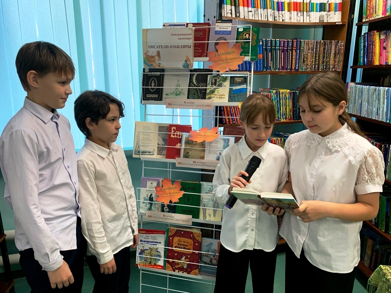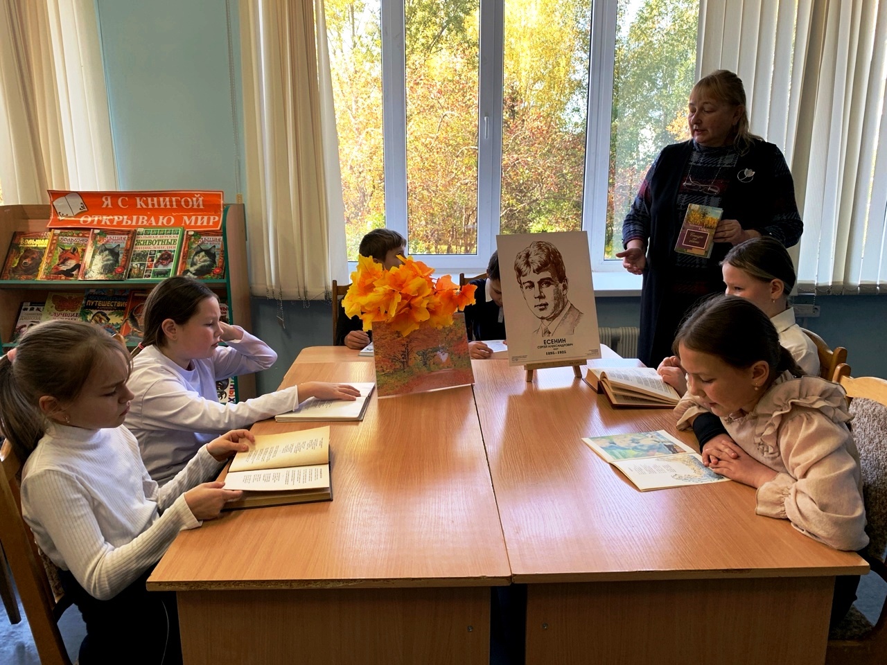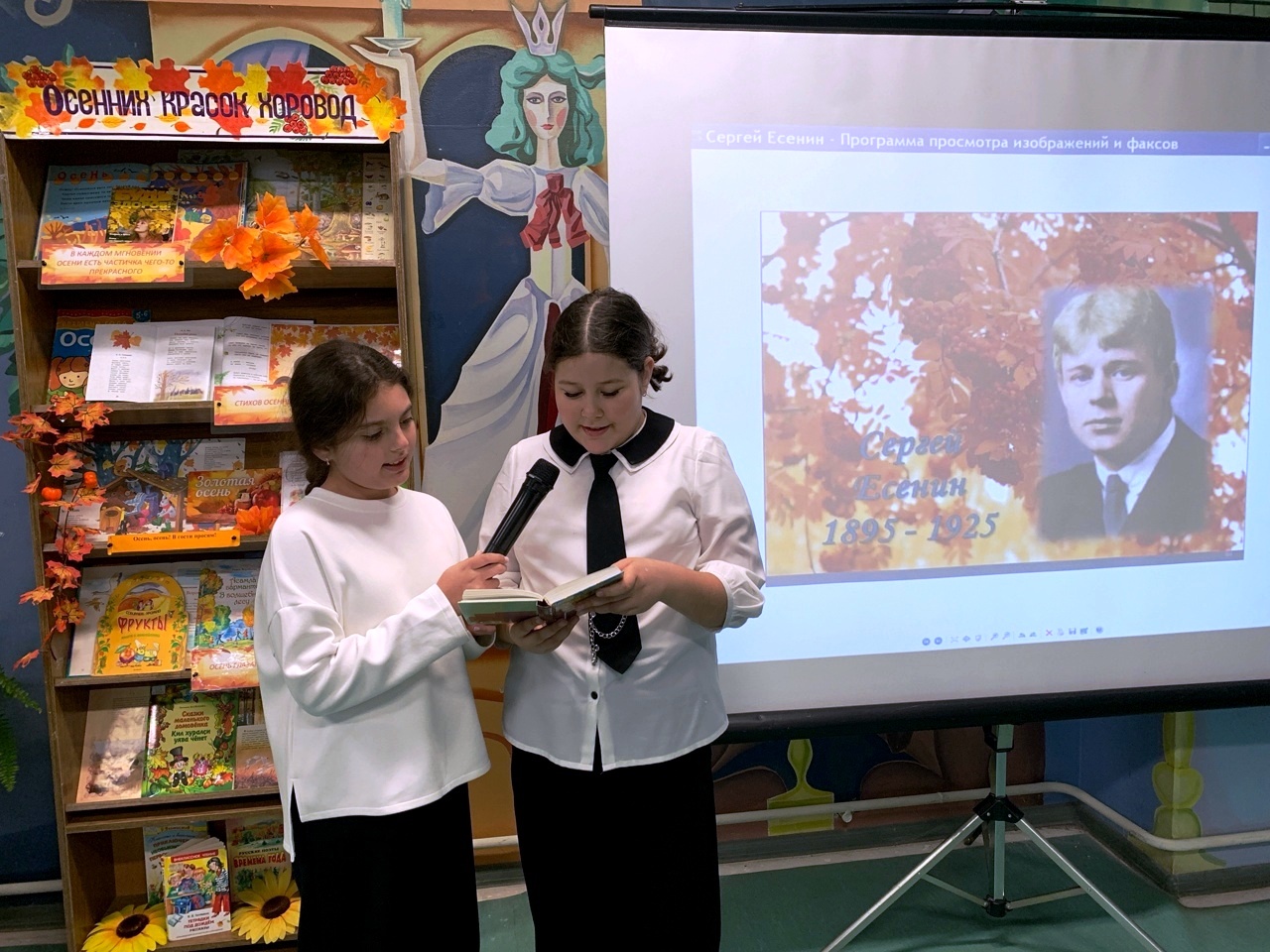 К юбилею Сергея Есенина в Молодежной библиотеке им. К. Чуковского с учащимися 4-х классов средней школы №2 прошел открытый микрофон «Читая Есенина!». Библиотекарь Васильева Светлана рассказала ребятам о жизни и творчестве поэта, познакомила с книжной выставкой «Писатели — юбиляры» октября.
