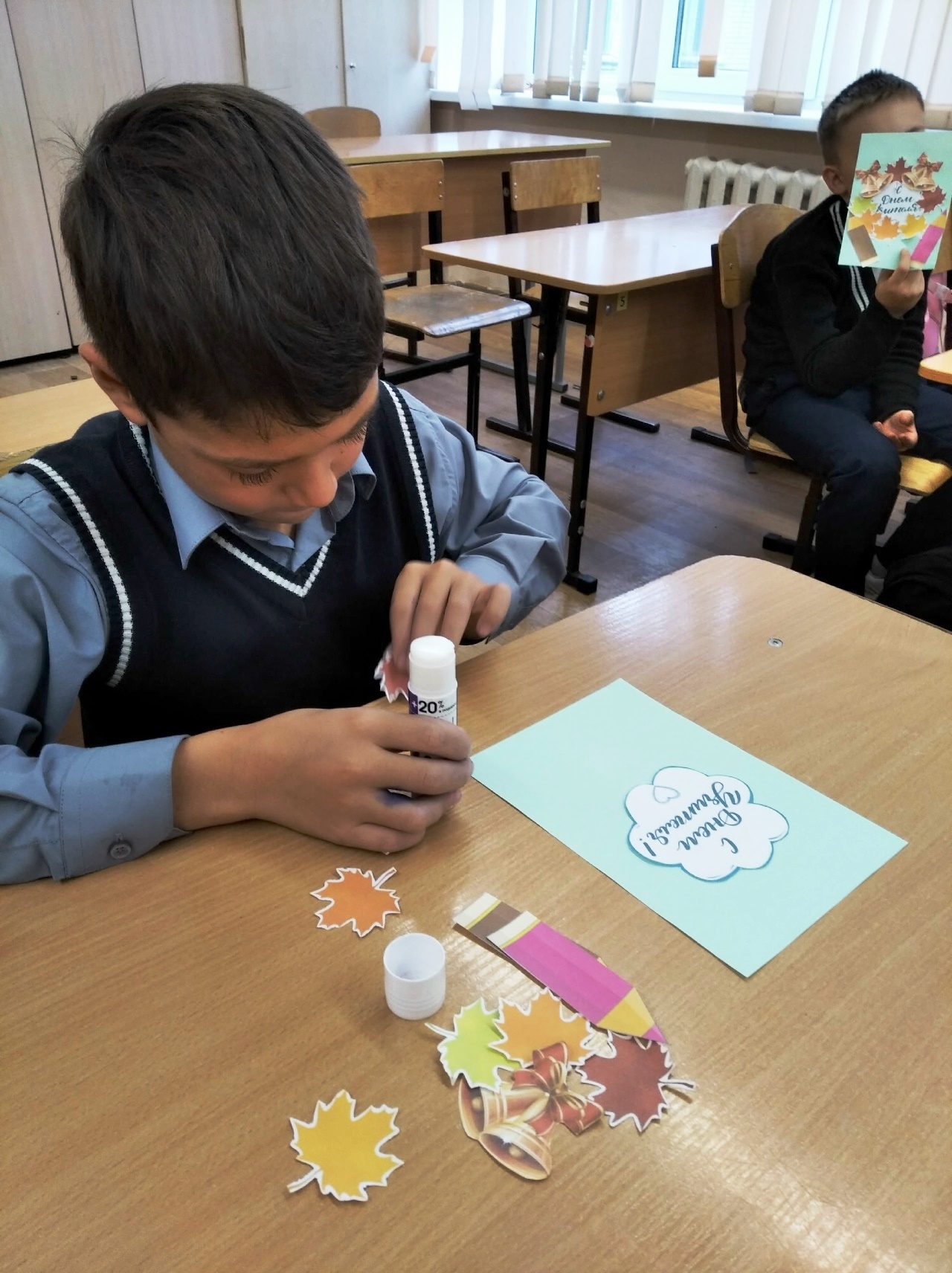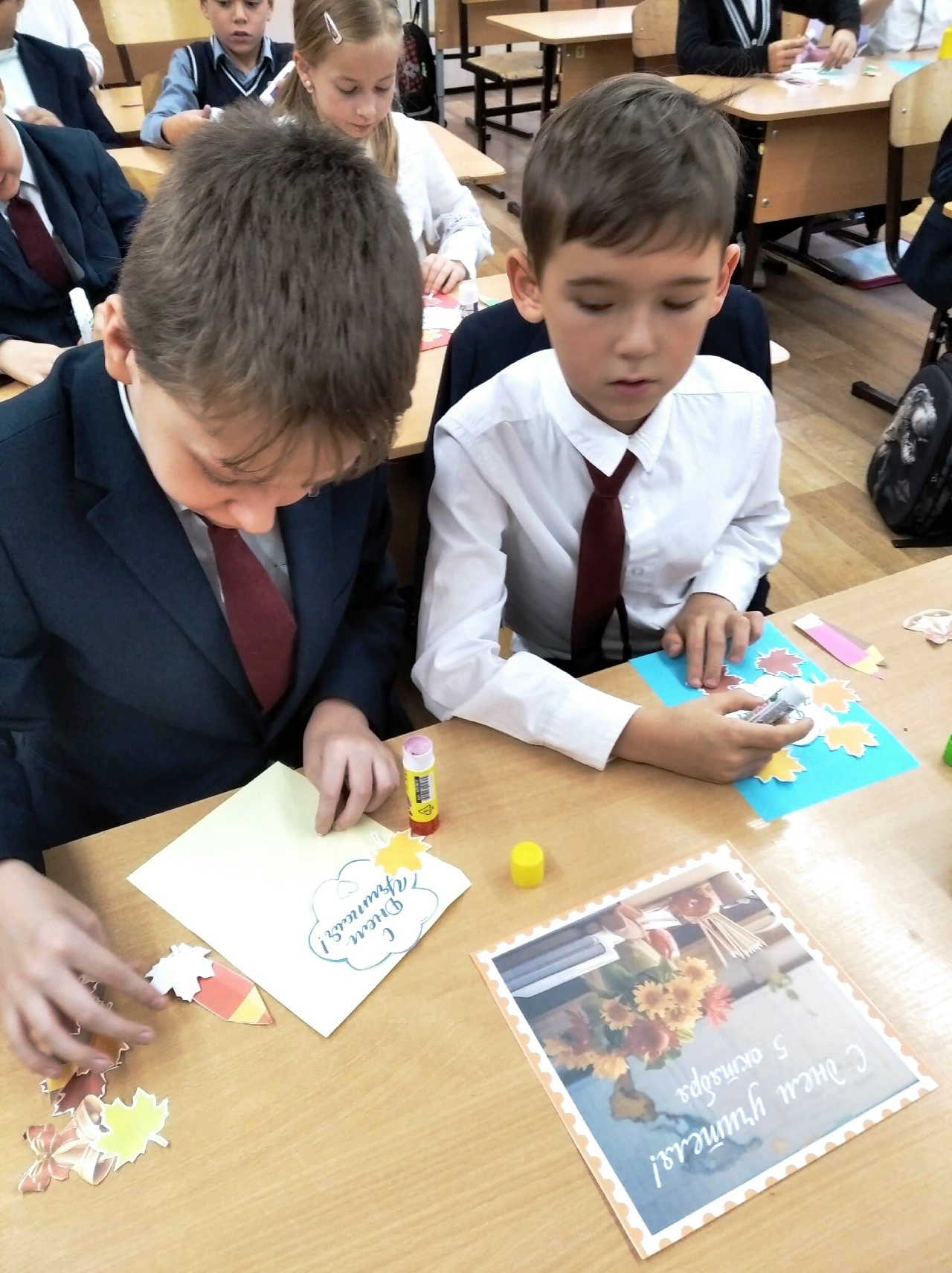 Порадовать любимого педагога в его профессиональный праздник можно яркой самодельной поделкой! На творческом мастер-классе учащиеся изготовили праздничные открытки из цветной бумаги и картона в технике «аппликация». С самого начала занятия ребята окунулись в творческий процесс. Они старательно и аккуратно вырезали и приклеивали каждый элемент изготовляемой ими открытки и оставили теплые поздравления для своих любимых учителей. Работы получились яркими, красочными, а пожелания в открытках были искренними и добрыми.