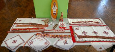Большой интерес вызвала у ребят выставка, на которой были представлены салфетки, полотенца, старинные чувашские женские головные уборы «масмак» и «сурпан».