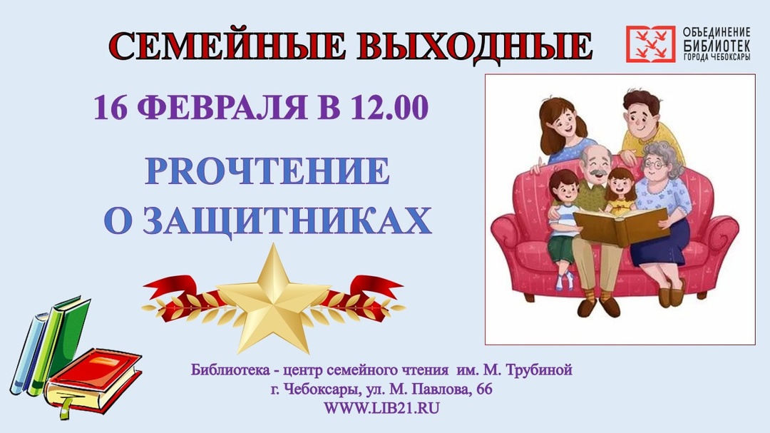 Библиотека – центр семейного чтения им. М. Трубиной приглашает 16 ФЕВРАЛЯ в 12.00 на праздничную программу, посвящённую ЗАЩИТНИКАМ ОТЕЧЕСТВА!