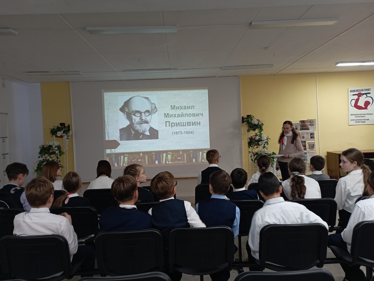 В ходе мероприятия сотрудник отдела художественной и детской литературы представил электронную презентацию, из которой участники узнали о жизни писателя, об истории создания им повести «Кладовая солнца» и порекомендовал учащимся для чтения и другие книги Михаила Пришвина, представленные на книжной выставке.