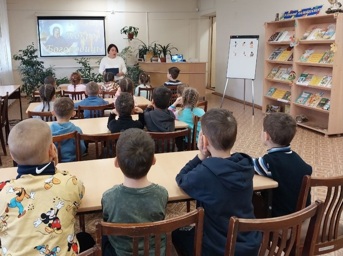 В библиотеке имени В. Сухомлинского прошёл православный час, посвящённый Покрову Пресвятой Богородицы. Дети из детского сада №95 узнали об истории праздника, его традициях и обрядах, вспомнили приметы, связанные с этим днём. Ребята приняли участие в весёлых играх и конкурсах: «Осенний калейдоскоп», «Загадки с грядки», «Узнай гриб», «Собери урожай», «Волшебный платок». Завершилось мероприятие пожеланием, которое дружно сказали хором: «Батюшка Покров, покрой наш дом теплом, а всех ребят - добром!».