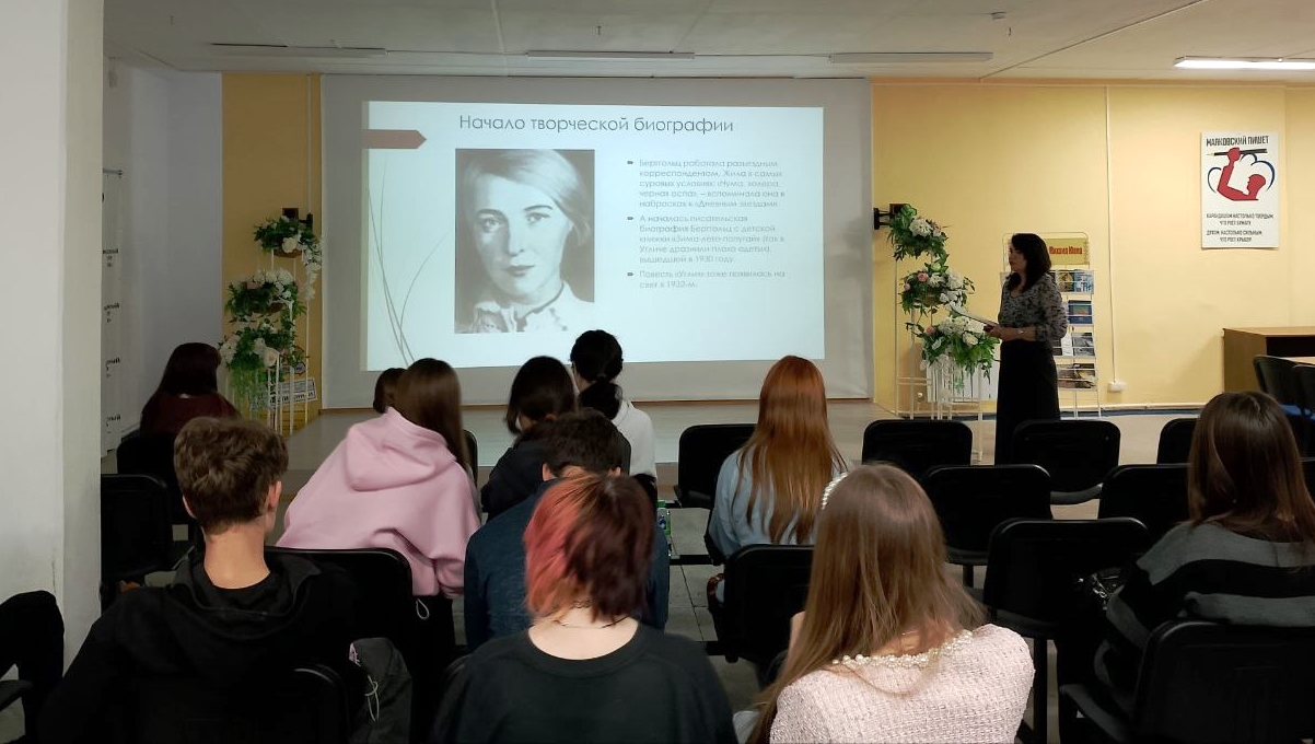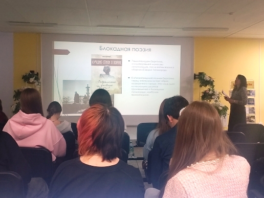 Сотрудники отдела художественной и детской литературы, используя электронную презентацию, познакомили с трагической судьбой и творчеством Ольги Берггольц в годы Великой Отечественной войны, когда ее поэтический талант проявился в полную силу. Студентам были представлены аудио- и видеохроники тех времен, где можно было услышать ленинградский метроном и чтение стихов самой поэтессой.