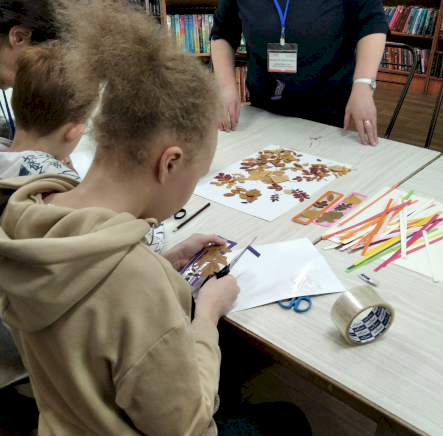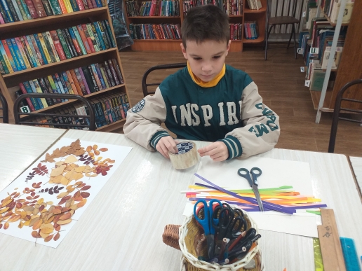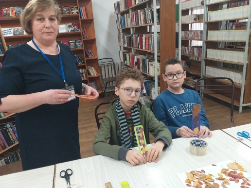 Сотрудники отдела художественной и детской литературы помогали ребятам осваивать интересную технику изготовления закладки из скотча, цветной бумаги и сухих листьев.
