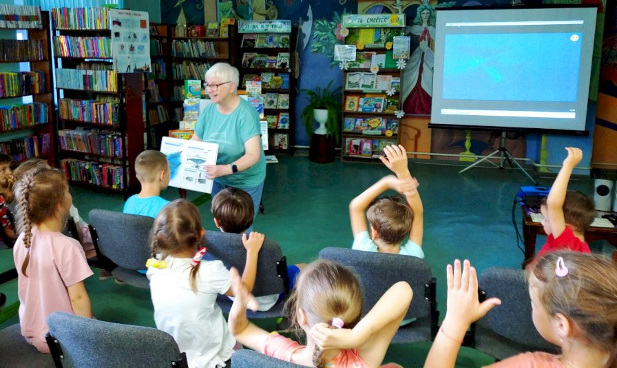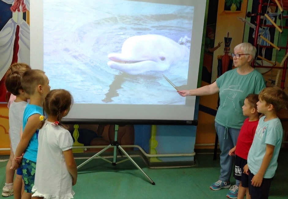 Далее, в ходе мероприятия, Людмила Сергеевна рассказала юным читателям о том, что киты и дельфины — это уникальные млекопитающие, их поведение свидетельствует об их высоком интеллекте.