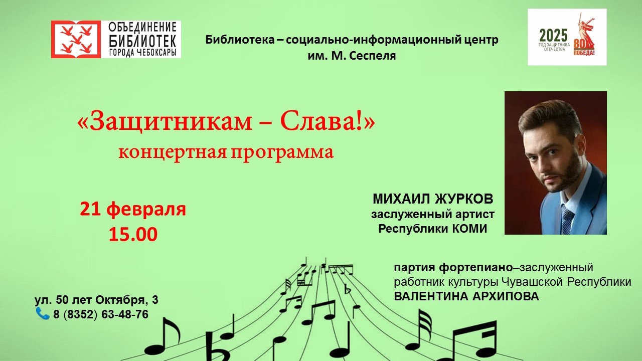 Уважаемые любители и ценители вокального искусства! Приглашаем Вас 21 февраля в 15.00 часов в библиотеку имени М. Сеспеля на праздничный концерт «Защитникам – Слава!».