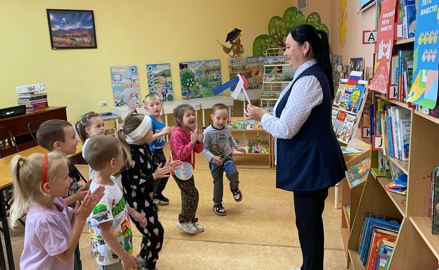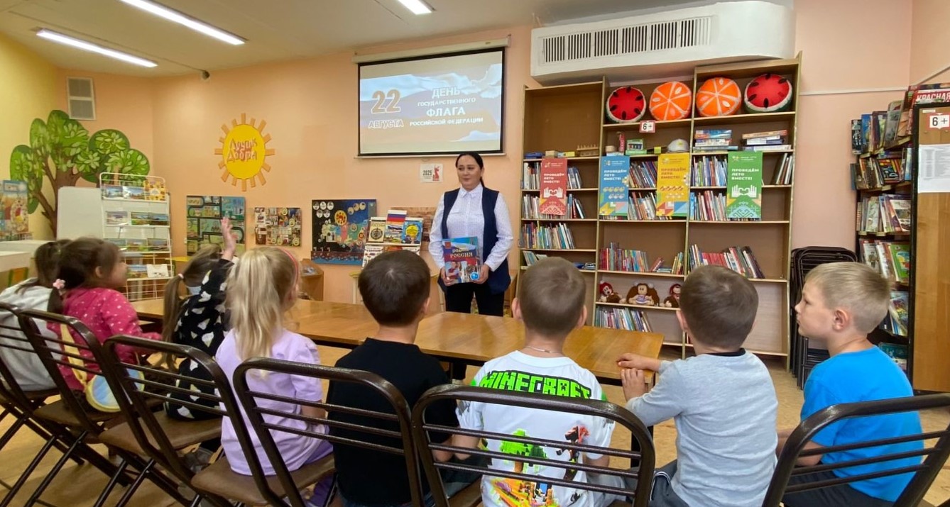 Библиотекарь рассказала юным читателям об истории российского флага, объяснила, почему на флаге именно такое расположение цветов и что они символизируют.