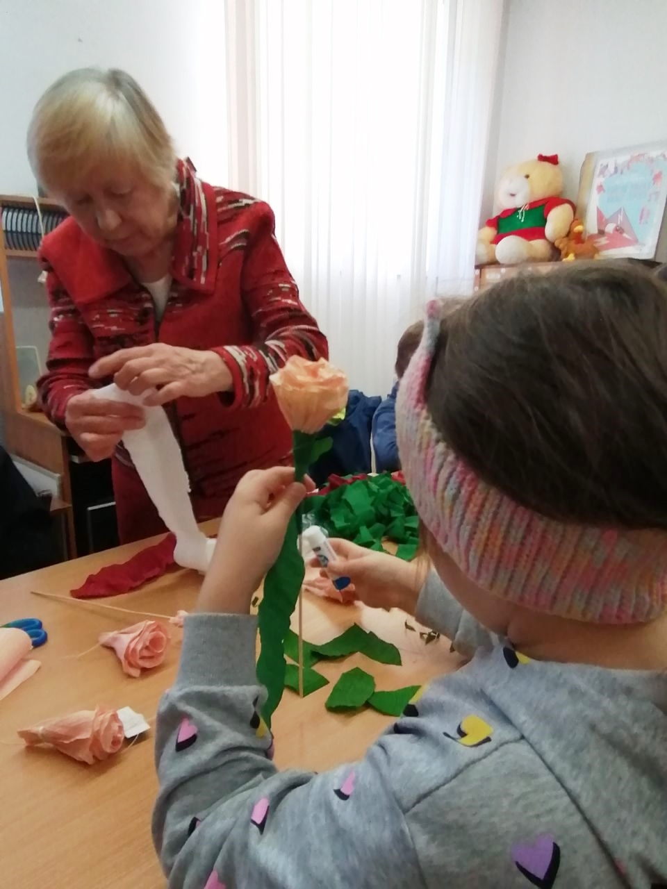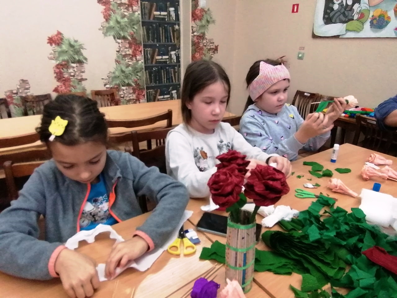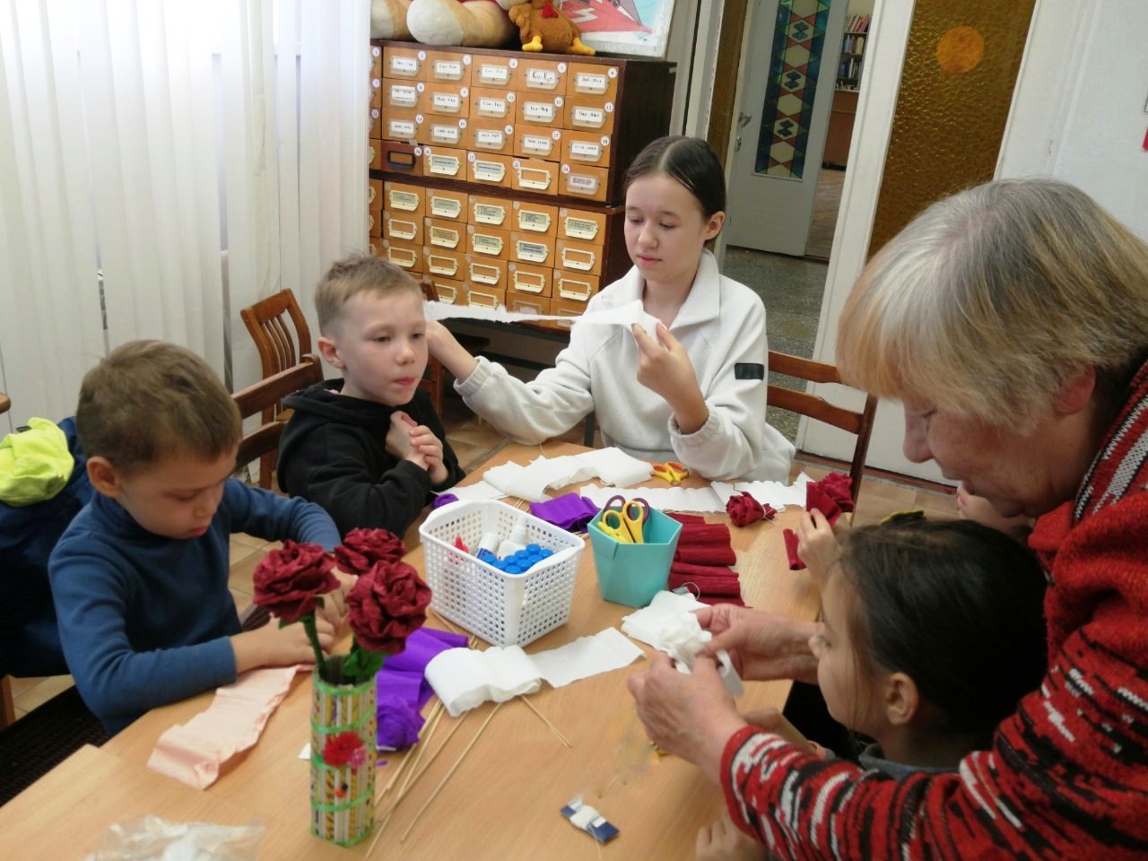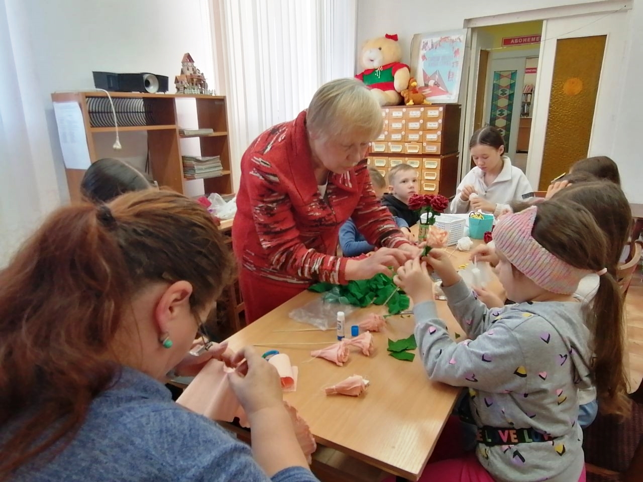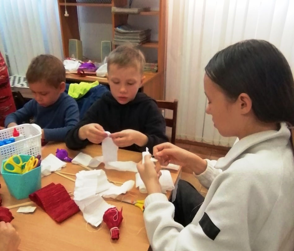 Так поступили и ребята из нашего микрорайона. Они посетили библиотеку им. Л. Кассиля, где прошёл яркий мастер-класс «Букет из роз» под руководством Людмилы Викторовны Судаковой.