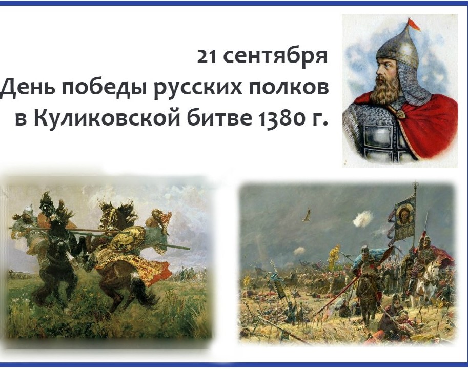 В истории народов есть знаковые для национального самосознания и гордости события. В русской истории одно из них — Куликовская битва XIV века. Она стала символом борьбы народа за независимость и государственность. Куликовская битва произошла 8 сентября 1380 года на Куликовом поле в верхнем течении реки Дон. В сражении участвовали русские войска под предводительством владимирского и московского великого князя Дмитрия Донского и татарское войско во главе с темником Мамаем. Битва завершилась разгромом татарского войска и положила начало освобождению русского народа от золотоордынского ига.