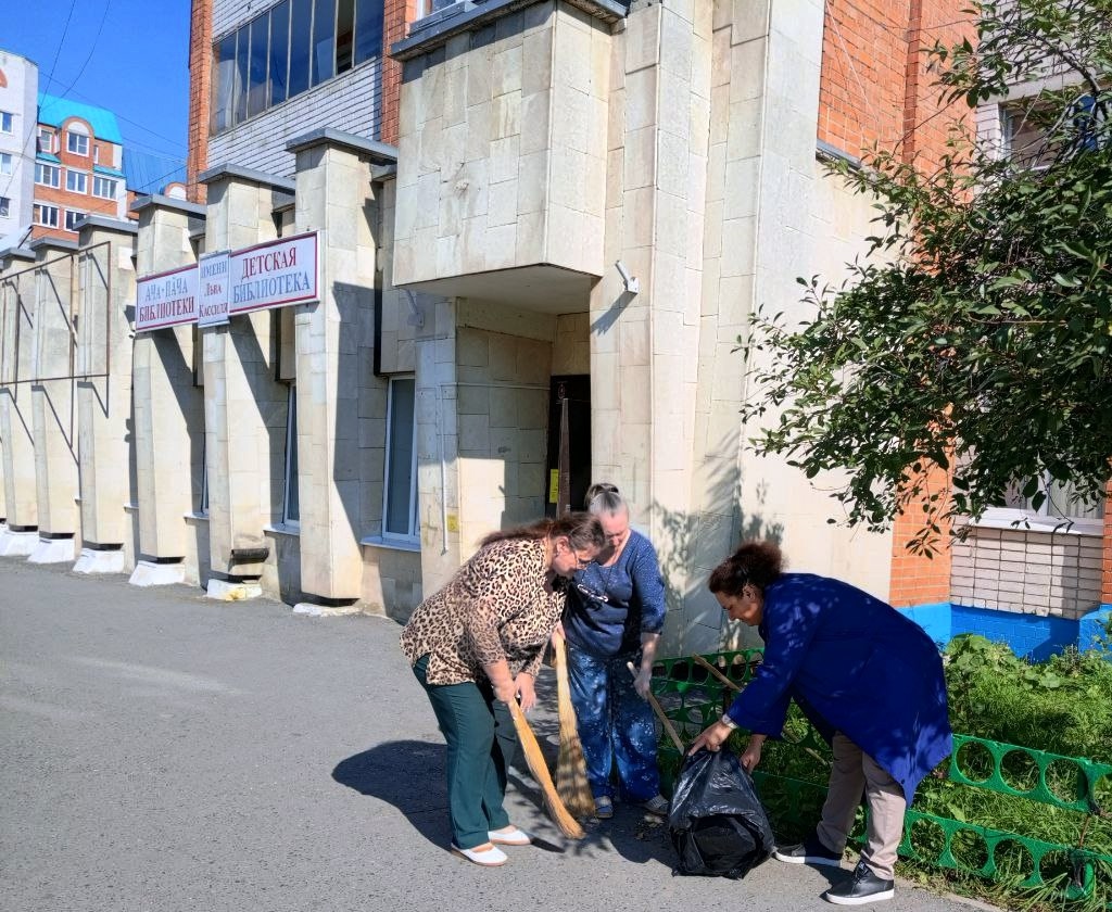 В рамках мероприятия сотрудники библиотек вооружились уборочным инвентарем и вышли на уборку территории.