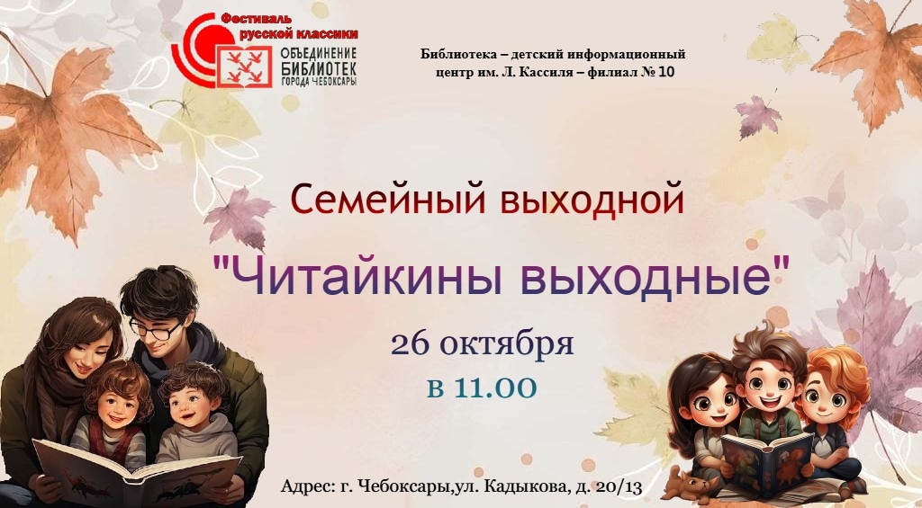 Уважаемые читатели! Библиотека – детский информационный центр им. Л. Кассиля приглашает всех желающих 26 ОКТЯБРЯ на семейный выходной! Мероприятие пройдет в рамках Фестиваля русской классики.