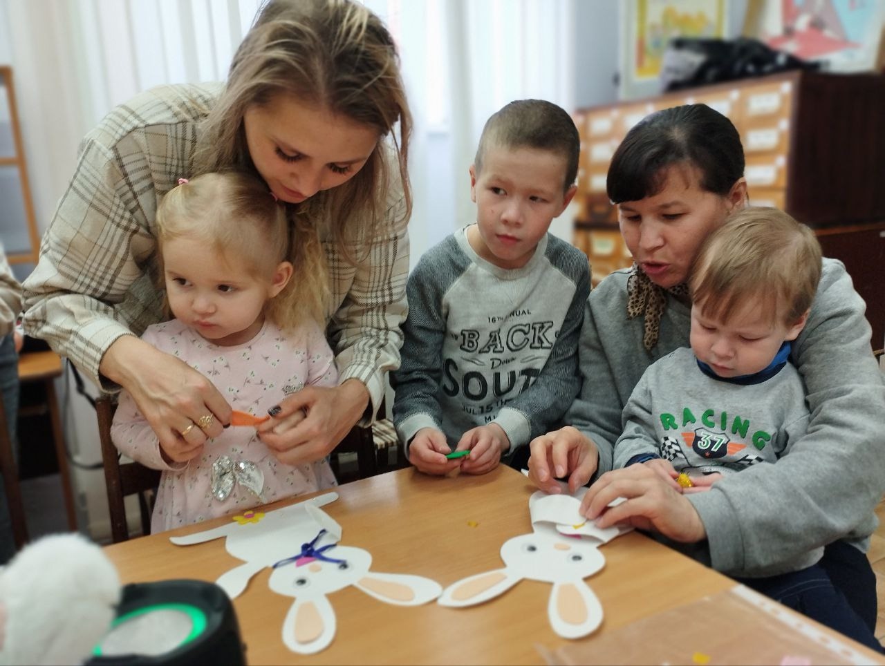 Затем ребятишек ждали настоящие приключения. Малыши посмотрели сказку «Курочка Ряба» и настольный театр «Теремок». После чего вместе с мамами сделали аппликацию «Зайчик» из бумаги и фоамирана, а потом занимались лепкой из пластилина. Также сделали небольшую танцевальную паузу. Финальным аккордом стал добрый спектакль «Заюшкина избушка».