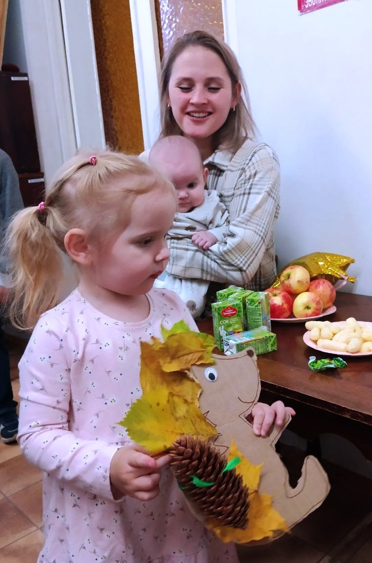 Все участники получили подарки от Екатерины: дети — наборы пластилина, воздушные шарики, мальчикам достались еще и маленькие машинки, девочкам — красивые резинки для волос, а мамам — красивый сертификат. Впрочем, подарки были не единственными сюрпризами: в подарок от малышей библиотеке достался чудесный «осенний ёжик» — милая поделка, которая тут же заняла место в «Осенней фотозоне».