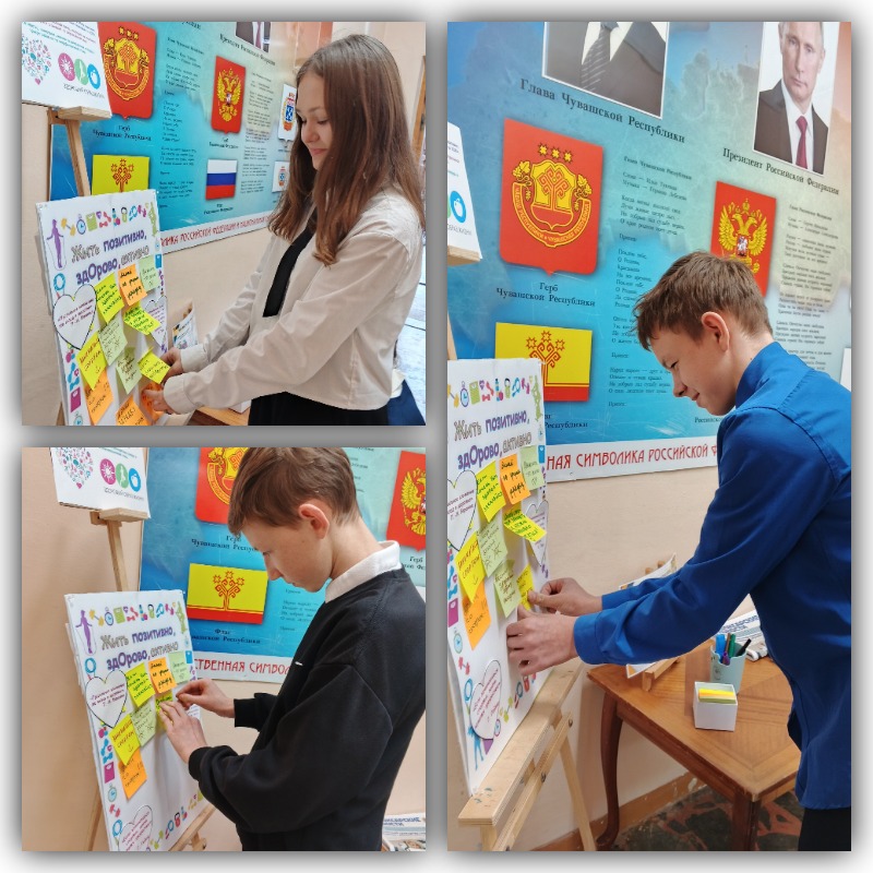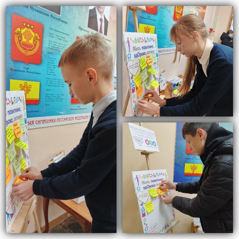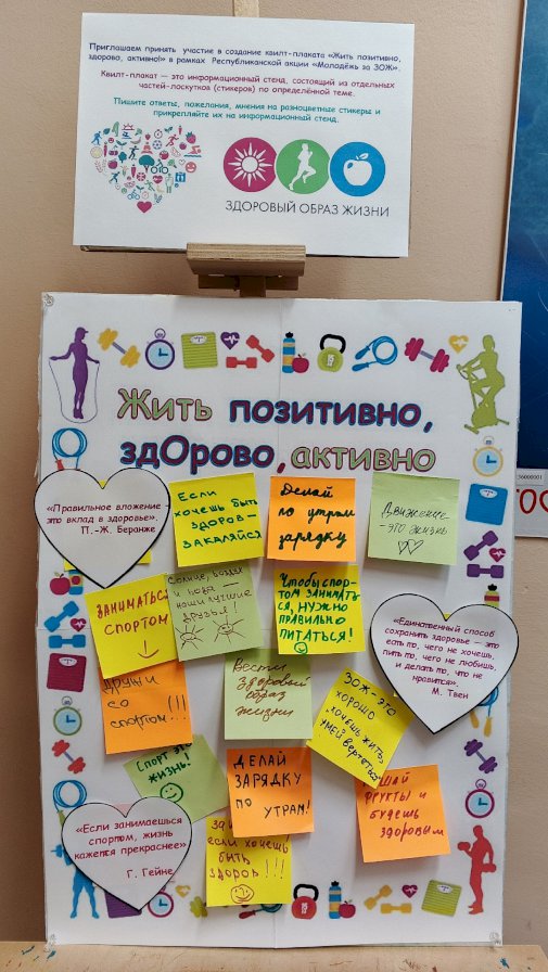 На данные вопросы участники акции отвечали в письменной форме на разноцветных стикерах, приклеивая их на информационную доску. Таким образом, создавался узор лоскутного полотна. Каждый участник высказал своё мнение о составляющих ЗОЖ, некоторые поделились полезными советами. Были высказаны пожелания заниматься спортом, отказаться от вредных привычек, правильно питаться.