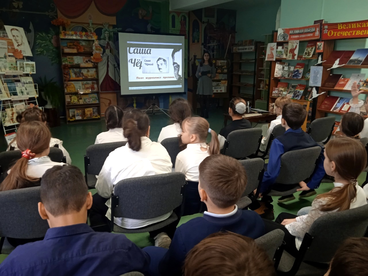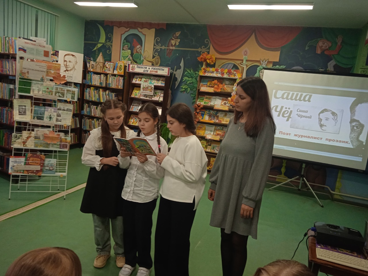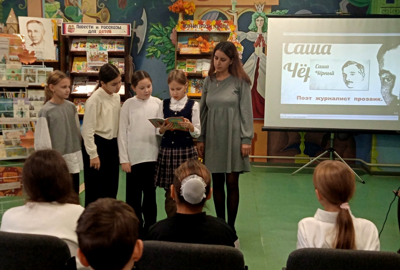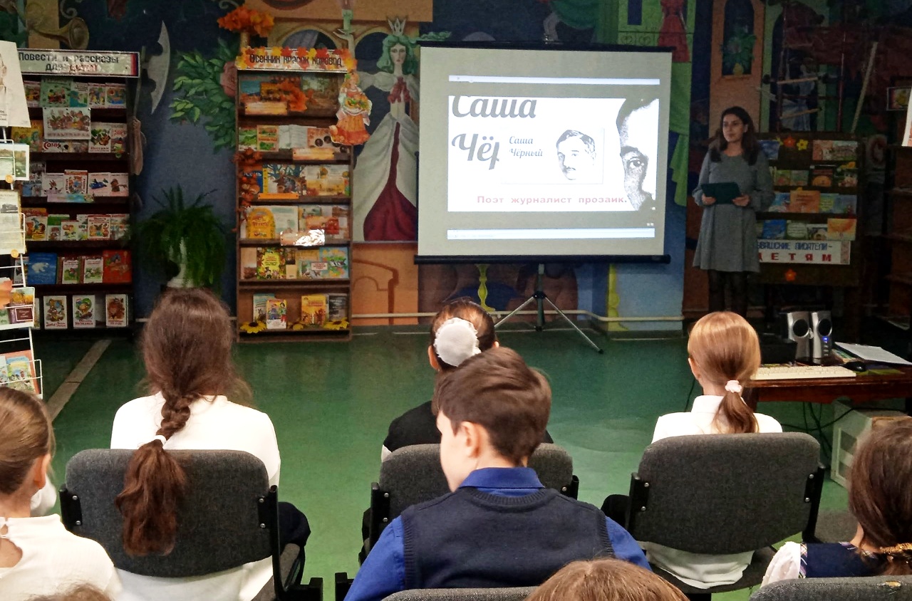 В рамках «Фестиваля русской классики-2025» в Молодежной библиотеке им. К. Чуковского с юными читателями прошел литературный час о поэте, прозаике и журналисте Саше Черном. Библиотекарь рассказала ребятам о том, что его настоящее имя Александр Михайлович Гликберг, что Саша Черный — это псевдоним, который он получил, потому что в семье был ещё один Саша — блондин («белый»), а сам он был брюнетом.