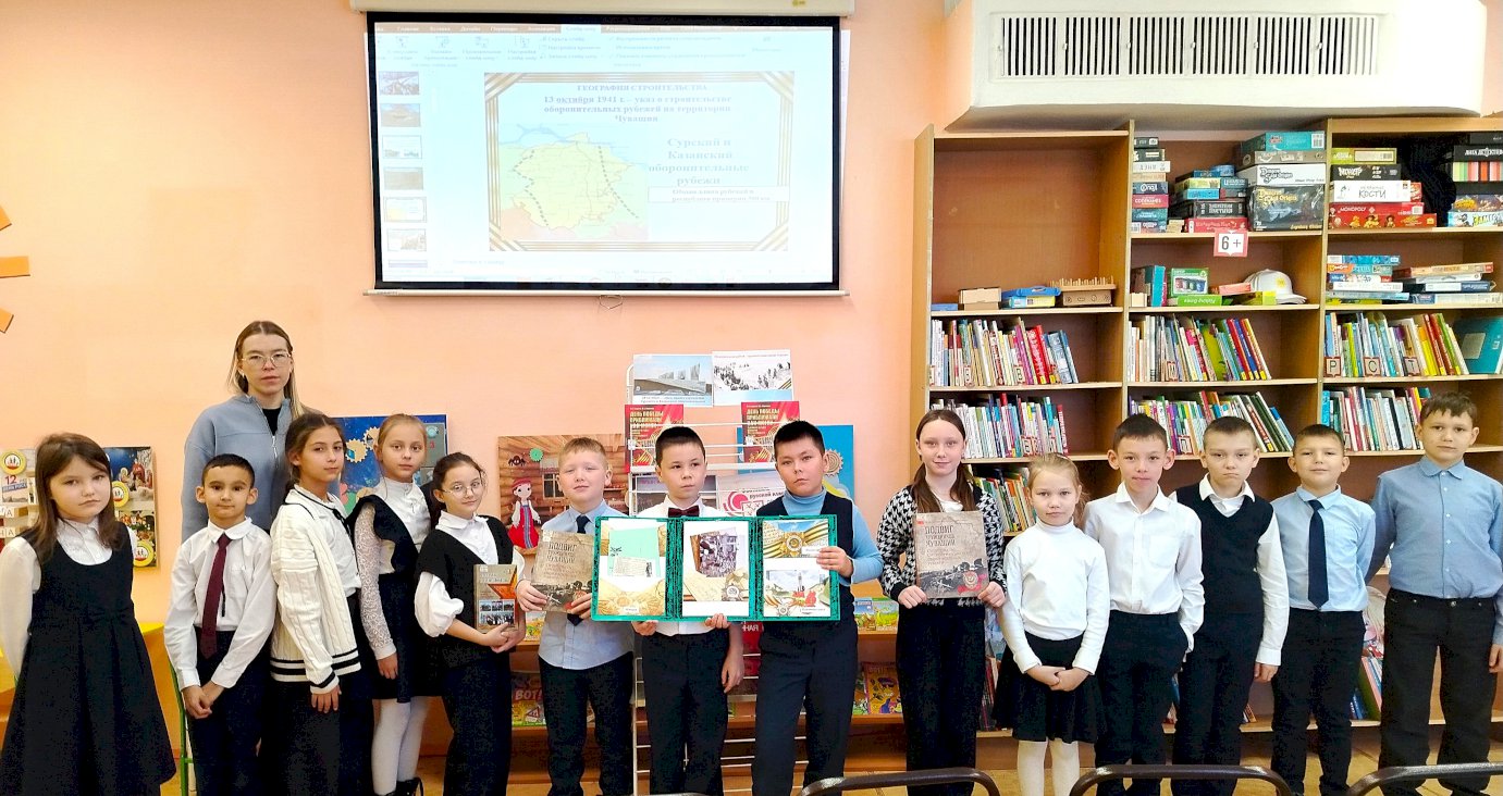 С помощью видеопрезентации "Сурский рубеж: история, память" библиотекарь рассказала участникам мероприятия о героизме женщин, пожилых людей, которые в тяжелейших условиях военного времени готовились оборонять свою Родину, строя Сурский и Казанский оборонительные рубежи зимой в 1941 и 1942 году. За период строительства на рубежах, протянувшихся на территории Чувашской Республики на 380 км, было вынуто около 5 мил. кубометров грунта, оборудовано 2347 огневых точек и 1970 землянок, в том числе по Сурскому рубежу - 1607 огневых точек и 1490 землянок. Благодаря трудовому подвигу людей, несмотря на трудности и сильный мороз, Сурский рубеж для защиты промышленных центров Волги и Урала был построен за рекордно короткий срок - 45 дней. Строительство на Сурском рубеже было завершено 20 января, на Казанском 25 января 1942 года.