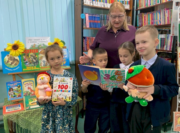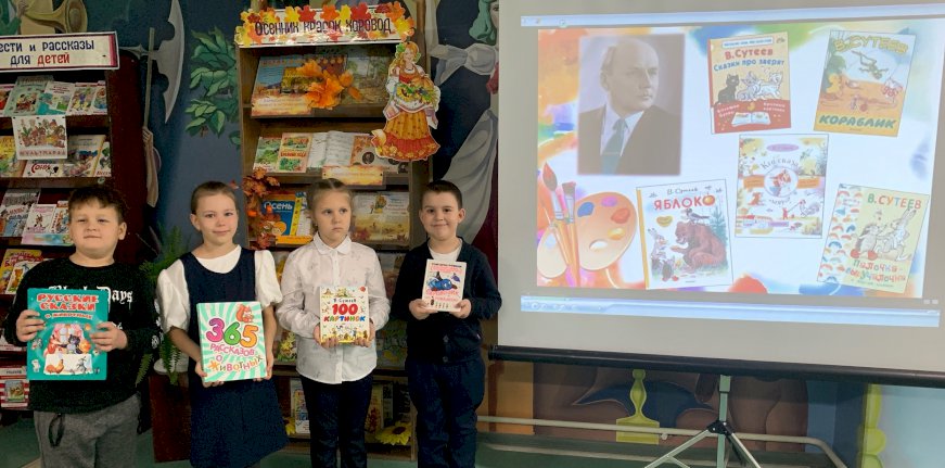 Затем юные читатели познакомились с творчеством детского писателя В. Г. Сутеева, героями произведений которого были звери и птицы. Ребята узнали, что Владимир Григорьевич был не только писатель, а еще художник-иллюстратор и режиссёр-мультипликатор. К своим произведениям он создавал мультфильмы и иллюстрации к ним.