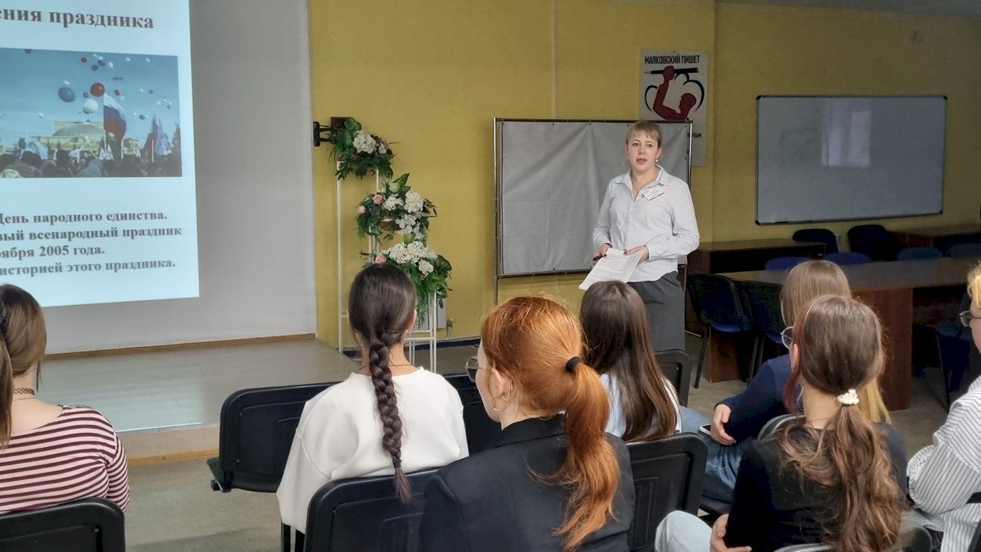 29 октября для студентов медицинского колледжа в библиотеке им. В. Маяковского состоялось мероприятие, посвящённое Дню народного единства, празднику, отмечаемому ежегодно 4 ноября. Мероприятие призвано напомнить молодым людям о важном историческом событии, которое символизирует единение народа перед лицом внутренних и внешних угроз.