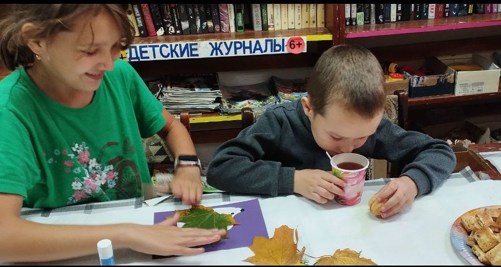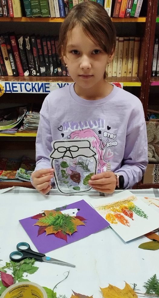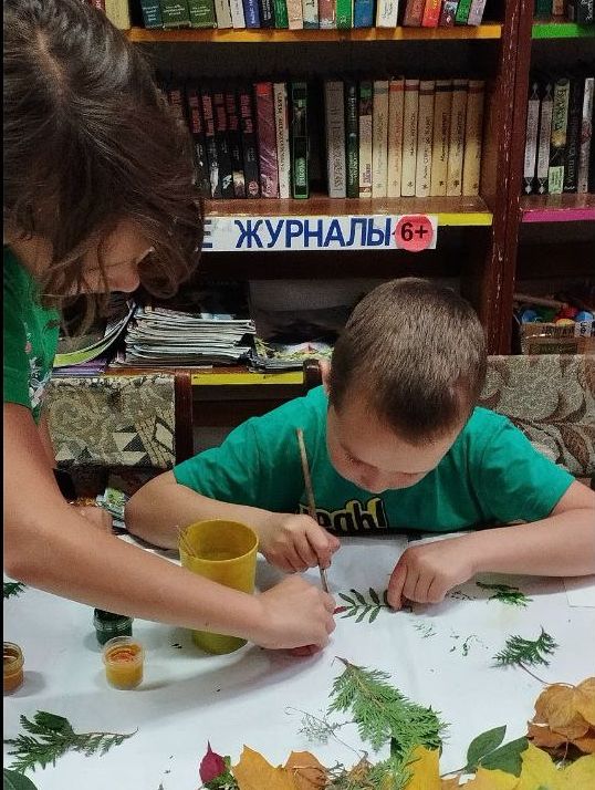 В библиотеку пришли ребята Восточного посёлка, чтобы вместе с сотрудником библиотеки изобразить осень совершенно разными способами: школьники и малыши рисовали листьями, собирали из них картины, делали осенний гербарий в «банке».