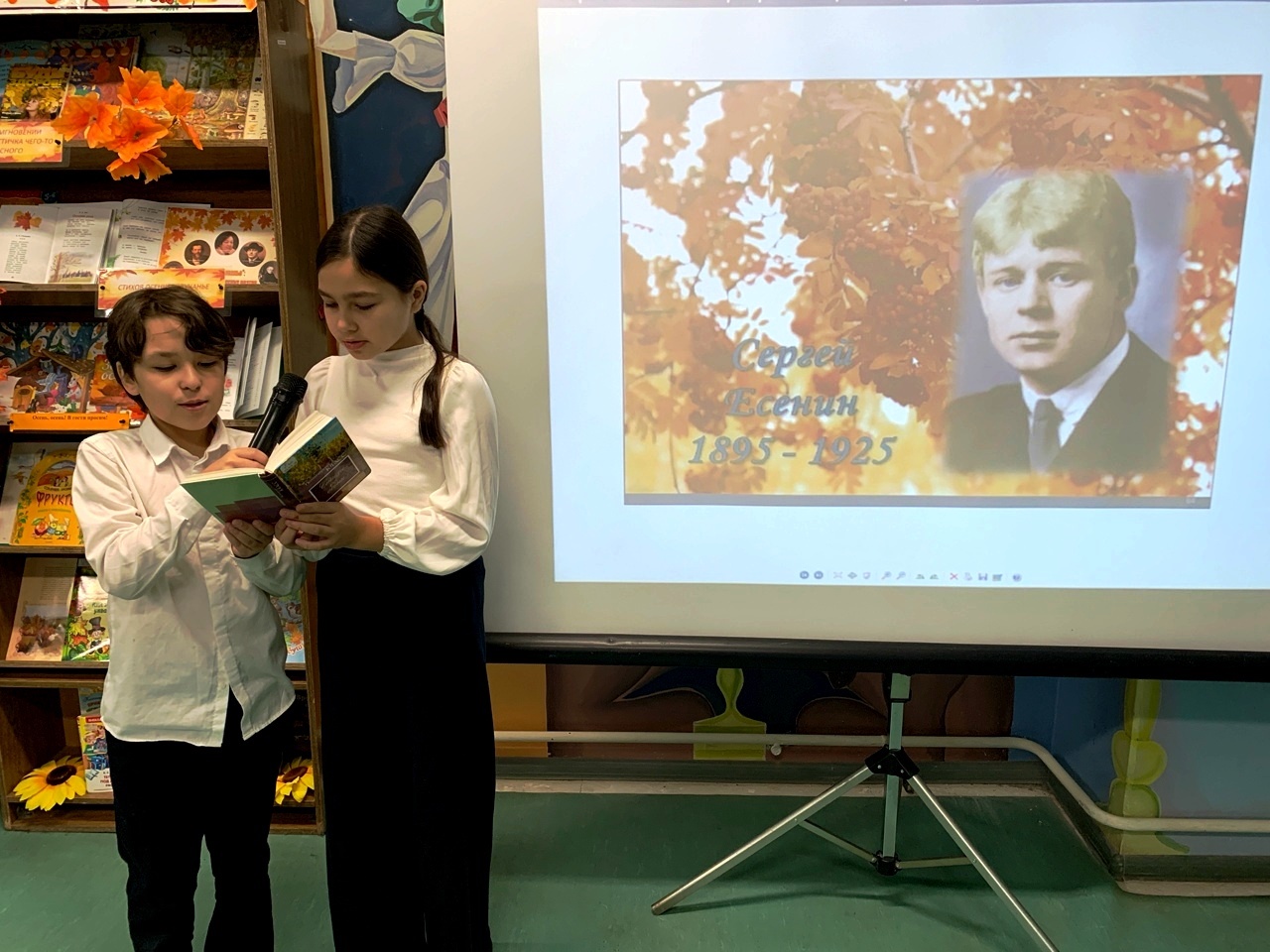 К юбилею Сергея Есенина в Молодежной библиотеке им. К. Чуковского с учащимися 4-х классов средней школы №2 прошел открытый микрофон «Читая Есенина!». Библиотекарь Васильева Светлана рассказала ребятам о жизни и творчестве поэта, познакомила с книжной выставкой «Писатели — юбиляры» октября.