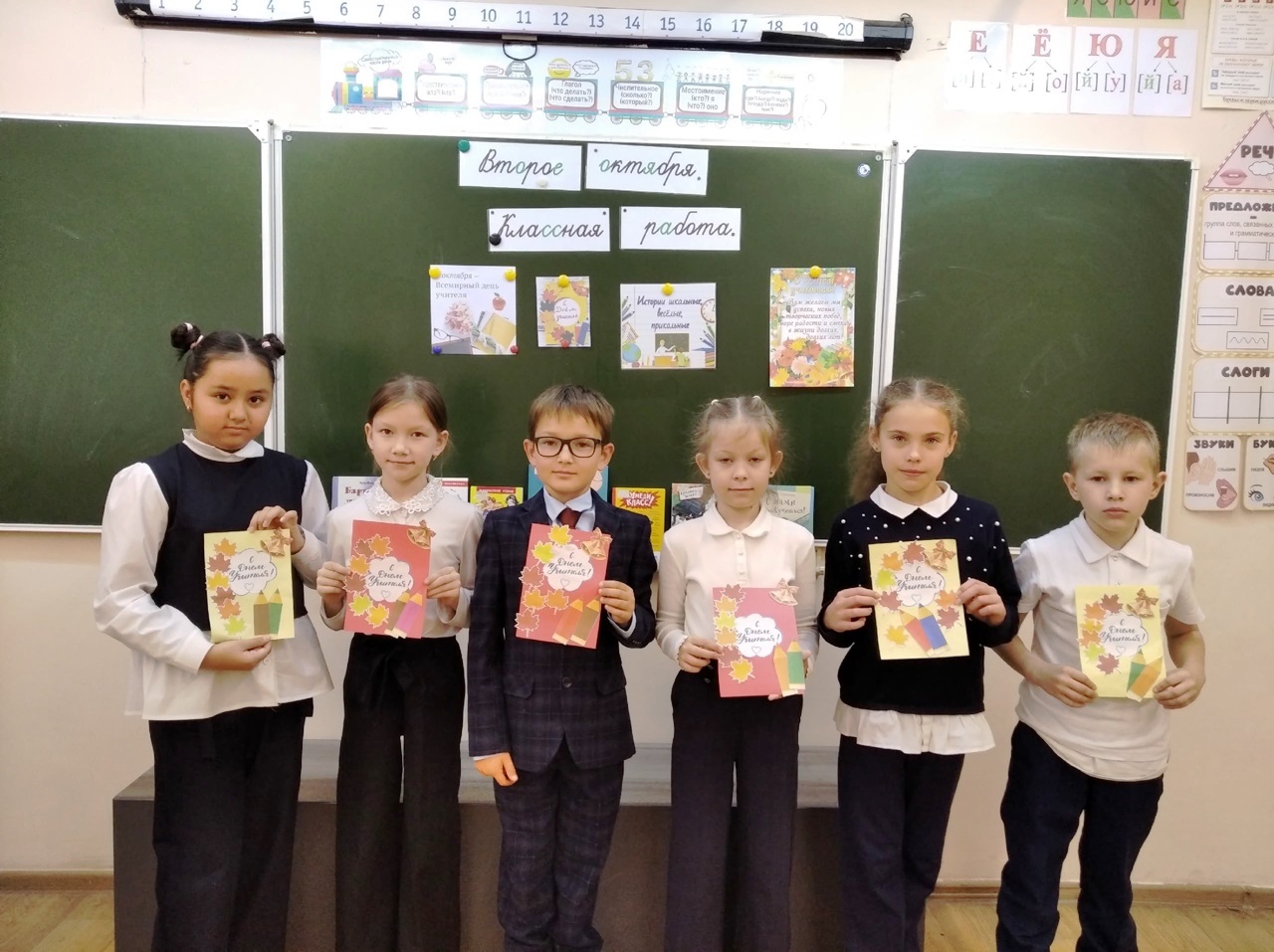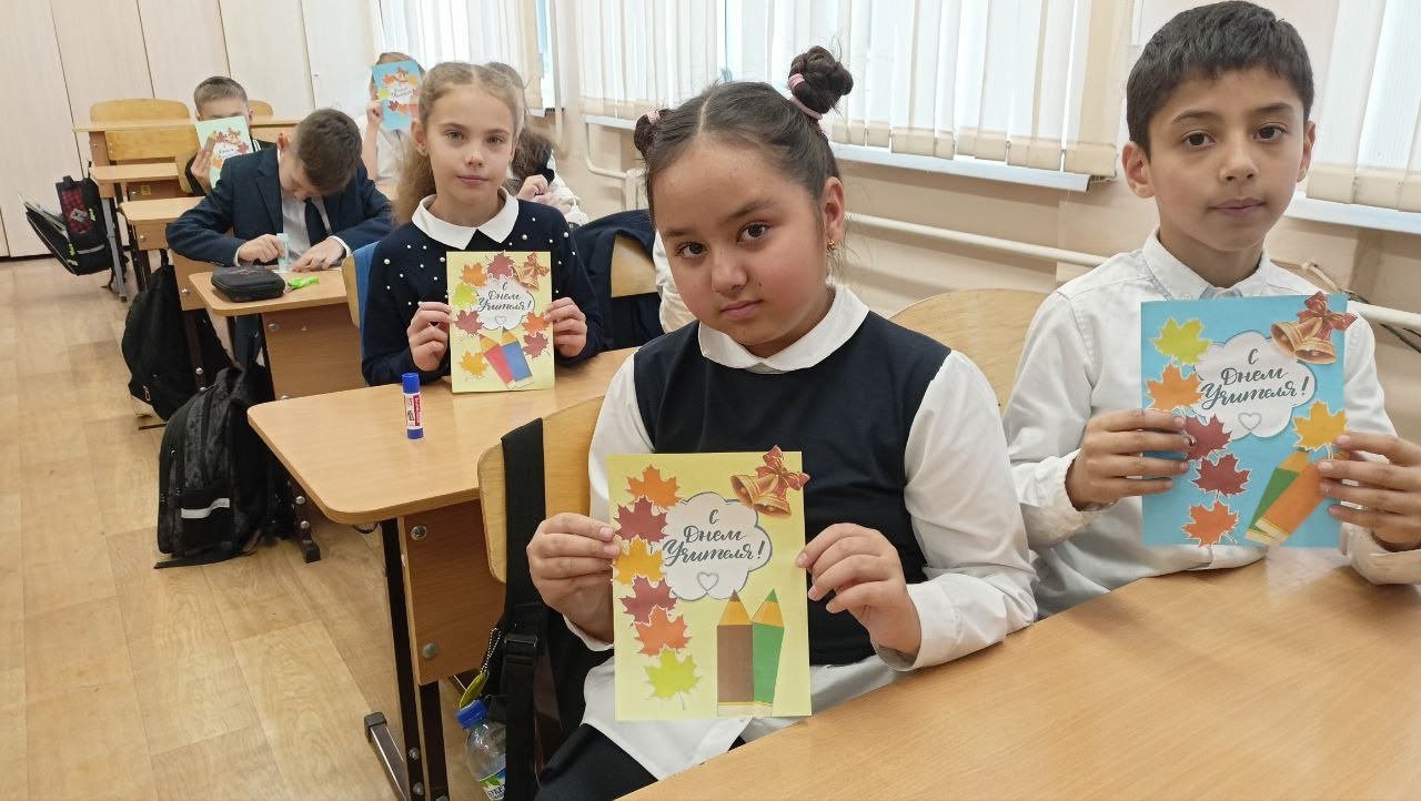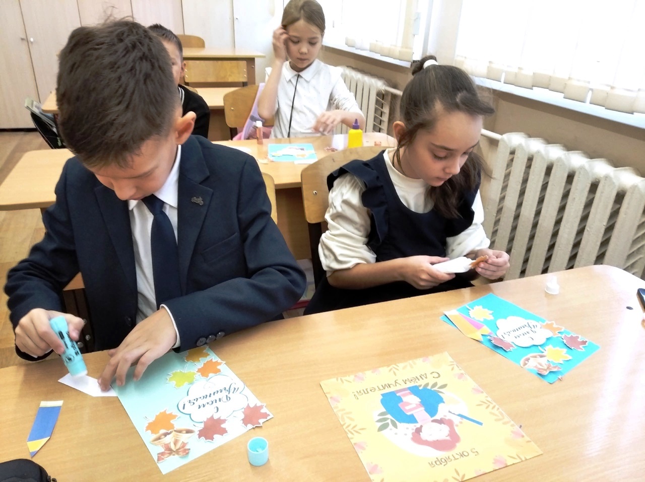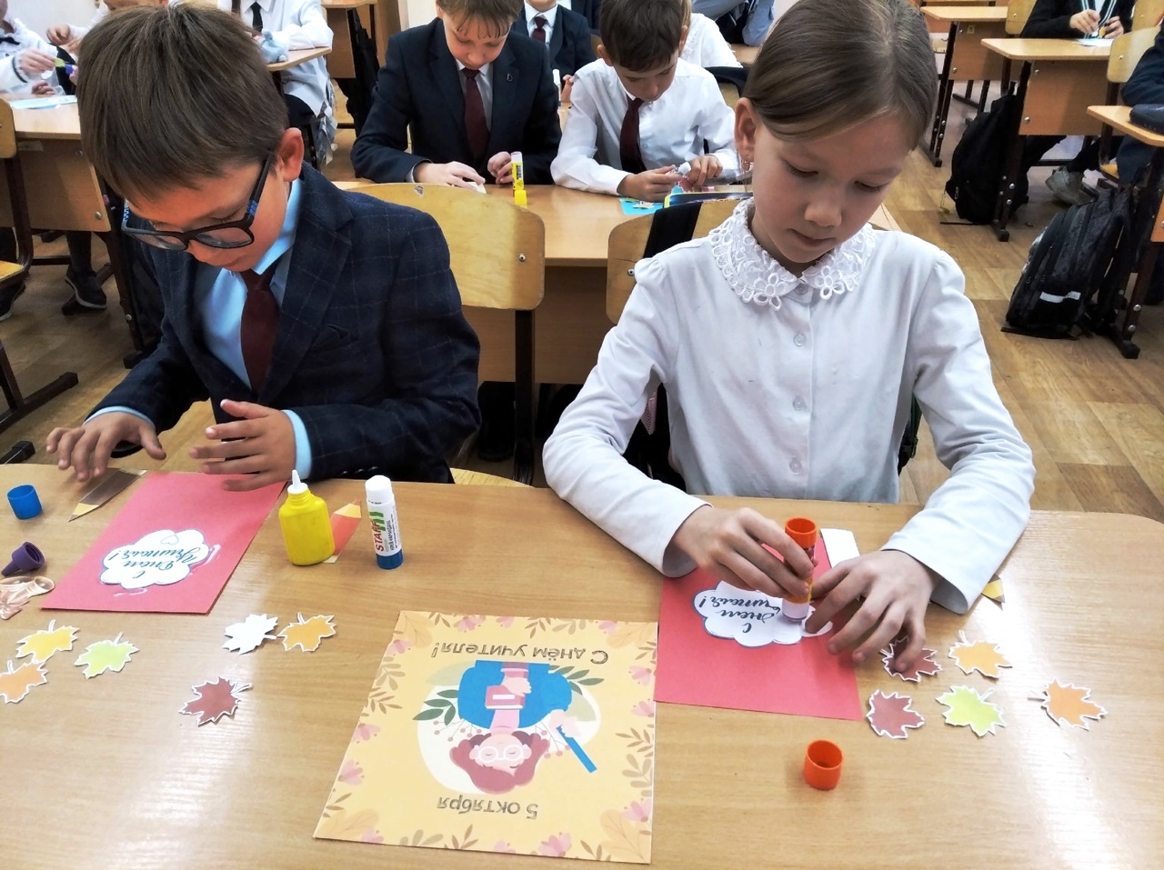 Порадовать любимого педагога в его профессиональный праздник можно яркой самодельной поделкой! На творческом мастер-классе учащиеся изготовили праздничные открытки из цветной бумаги и картона в технике «аппликация». С самого начала занятия ребята окунулись в творческий процесс. Они старательно и аккуратно вырезали и приклеивали каждый элемент изготовляемой ими открытки и оставили теплые поздравления для своих любимых учителей. Работы получились яркими, красочными, а пожелания в открытках были искренними и добрыми.