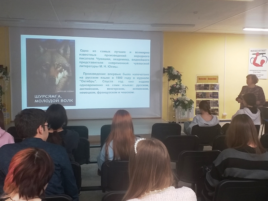 В рамках цикла мероприятий «По заповедным тропам» в Центральной городской библиотеке им. В. Маяковского со студентами Кооперативного института состоялся День книги народного писателя Чувашской Республики Михаила Николаевича Юхмы «Шурсямга: молодой волк», участвующей в ежегодном республиканском фестивале-конкурсе «Литературная Чувашия: самая читаемая книга 2024 года».